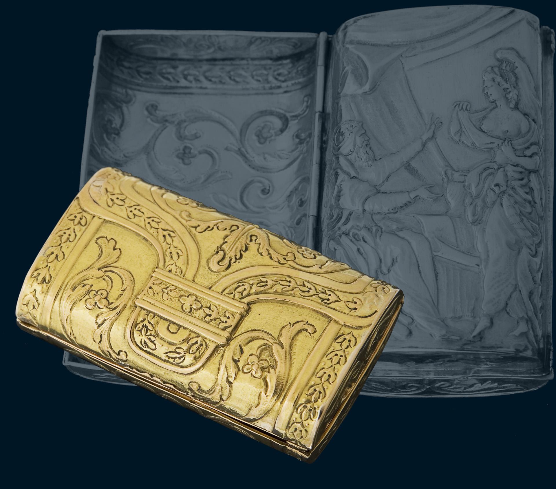 Allseits getrieben, Außenwandung mit floralen Elementen. Die Schließe auf dem Deckel symbolisiert den Zugang, Verborgenes oder Geheimnisvolles zu entdecken. Innen auf dem Geheimfach-Deckel eine erotische Darstellung "Liebespaar im Schlafgemach". Die attraktive und verführerische Femme fatale mit entblößten Brüsten wird von ihrem Liebhaber mit offenen Armen empfangen. Innen undeutliche Punzen. Mit Gold-Analyse der Firma Ott in Heilsbronn, 20.08.2021.