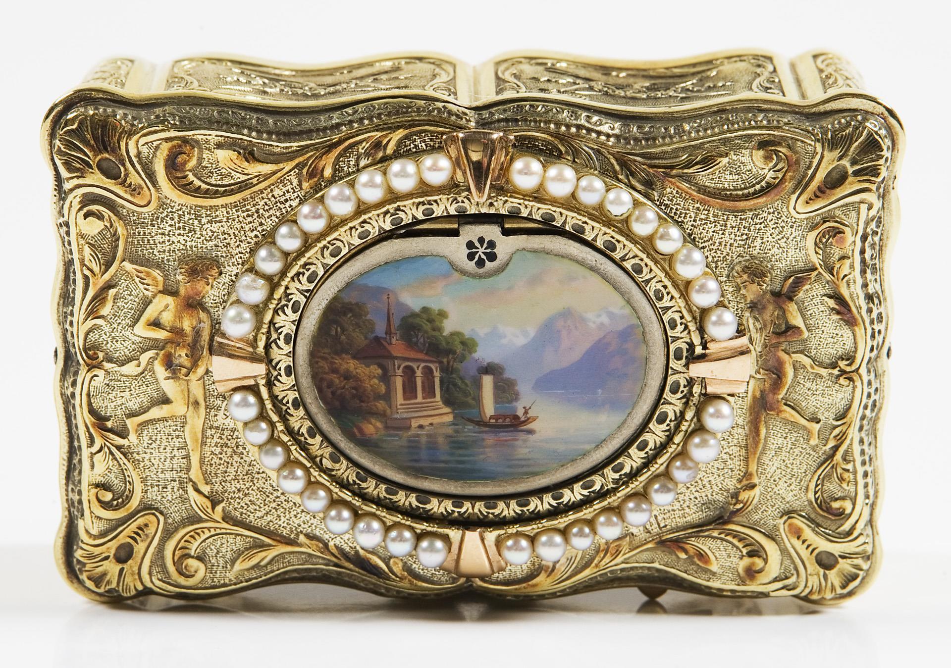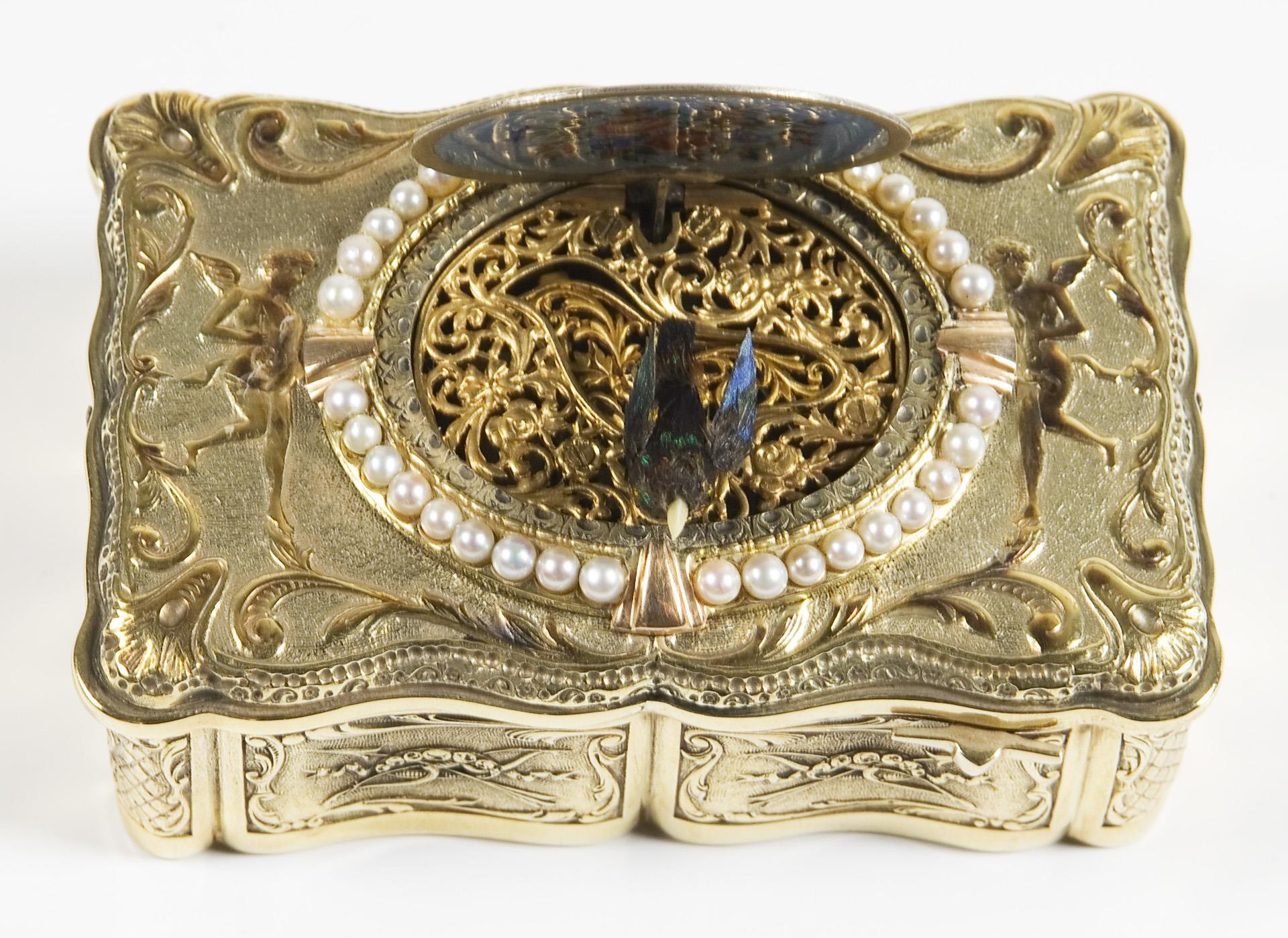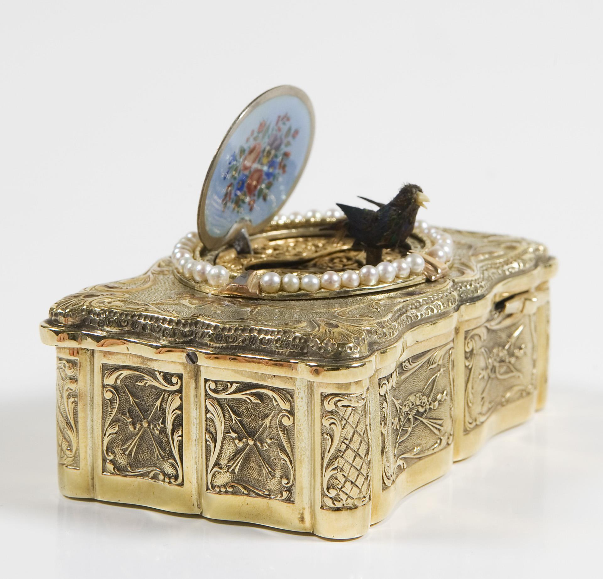 Platine signiert. Geschweifter rechteckiger Korpus, allseits reliefiert. Zwischen Ornamenten Amor, Pfeil und Bogen, auf dem Deckel Kartusche mit Saatperlchen und farbiger Emailmalerei. Mechanik mit aufklappbarem Deckel und beweglichem Vogel. Innendeckel mit farbigem Blumenbukett in Emailmalerei. Der trillernde Vogel mit schillerndem Gefieder, beweglichem Schnabel und flatternden Schwingen. Im Boden Federaufzug, Auslösen des Spielwerkes durch seitlichen Schieber, dabei Schlüssel mit schnäbelndem Taubenpaar und Herz im Rosenkranz.