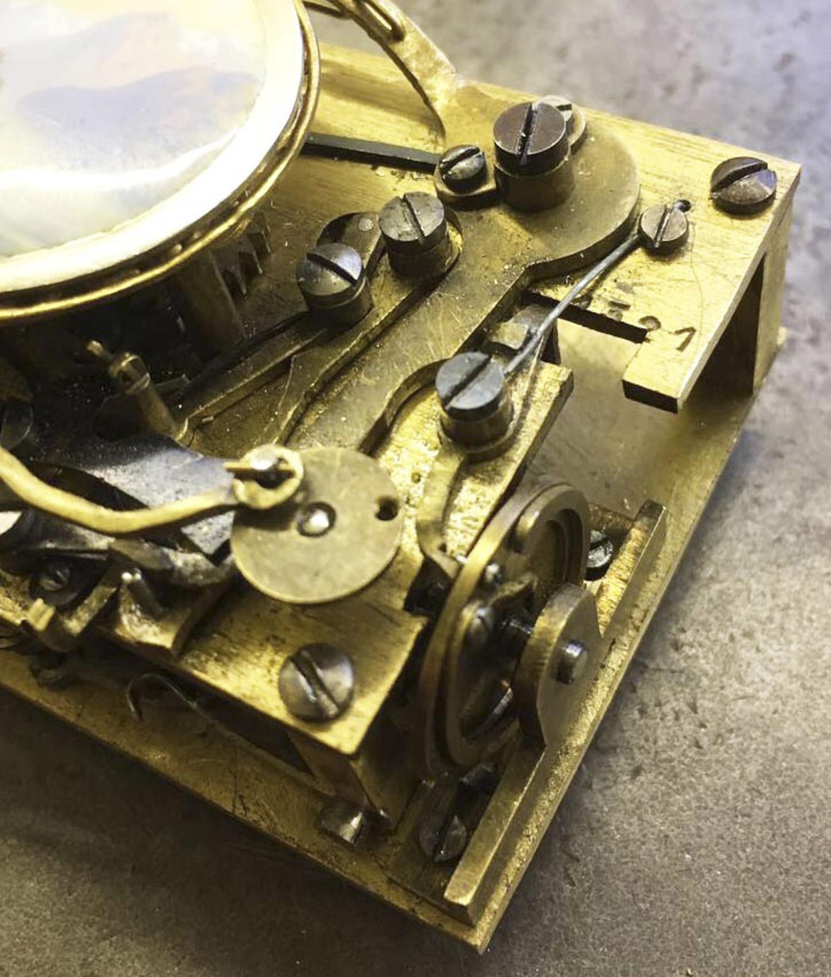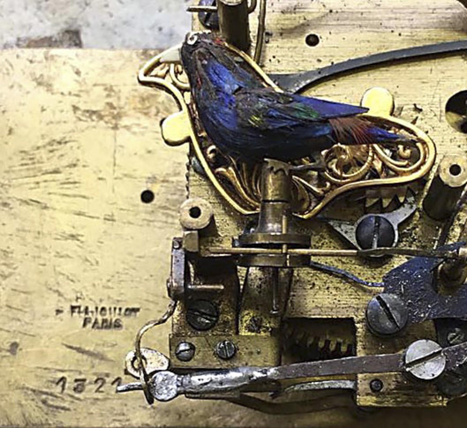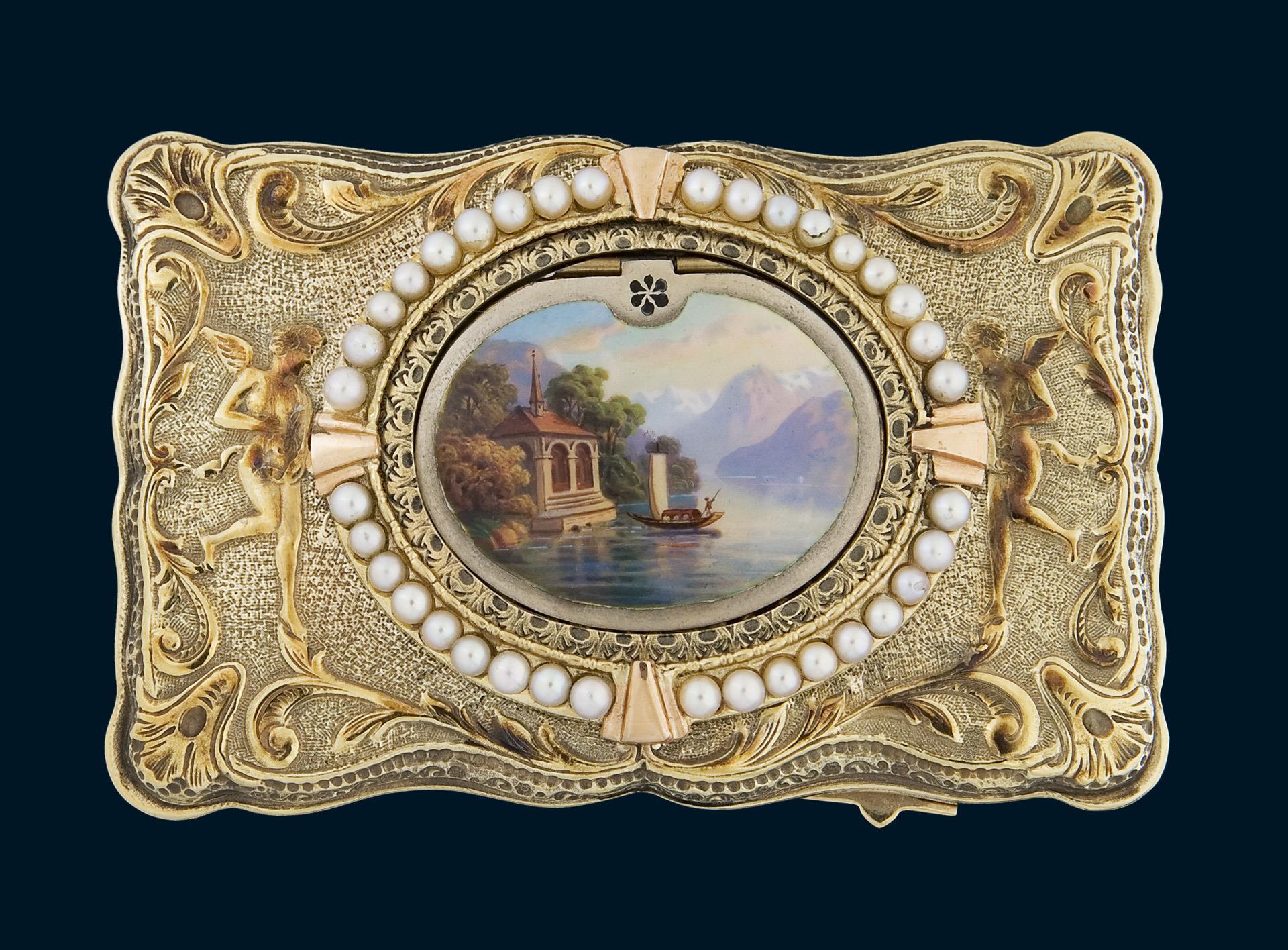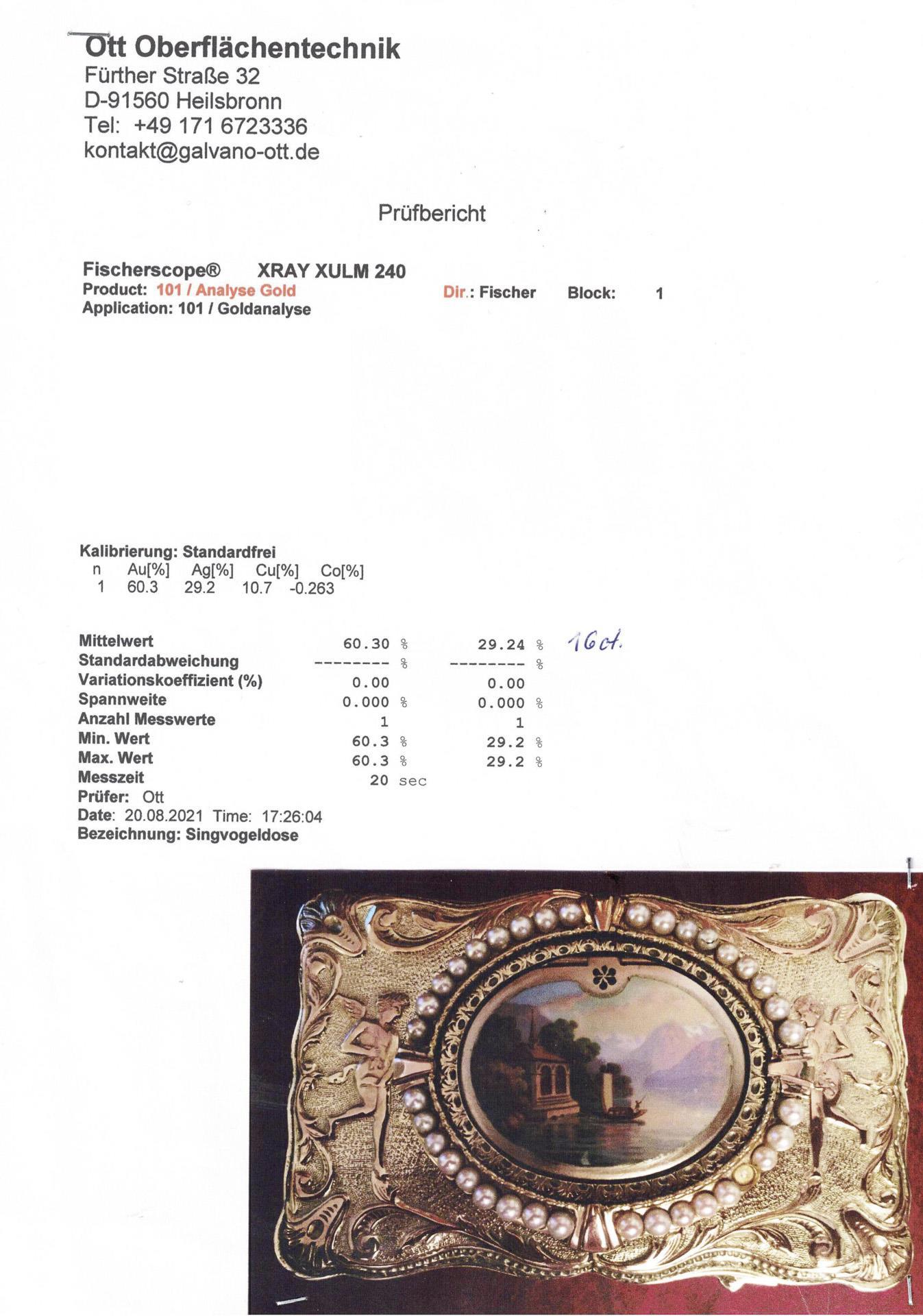 Platine signiert. Geschweifter rechteckiger Korpus, allseits reliefiert. Zwischen Ornamenten Amor, Pfeil und Bogen, auf dem Deckel Kartusche mit Saatperlchen und farbiger Emailmalerei. Mechanik mit aufklappbarem Deckel und beweglichem Vogel. Innendeckel mit farbigem Blumenbukett in Emailmalerei. Der trillernde Vogel mit schillerndem Gefieder, beweglichem Schnabel und flatternden Schwingen. Im Boden Federaufzug, Auslösen des Spielwerkes durch seitlichen Schieber, dabei Schlüssel mit schnäbelndem Taubenpaar und Herz im Rosenkranz.