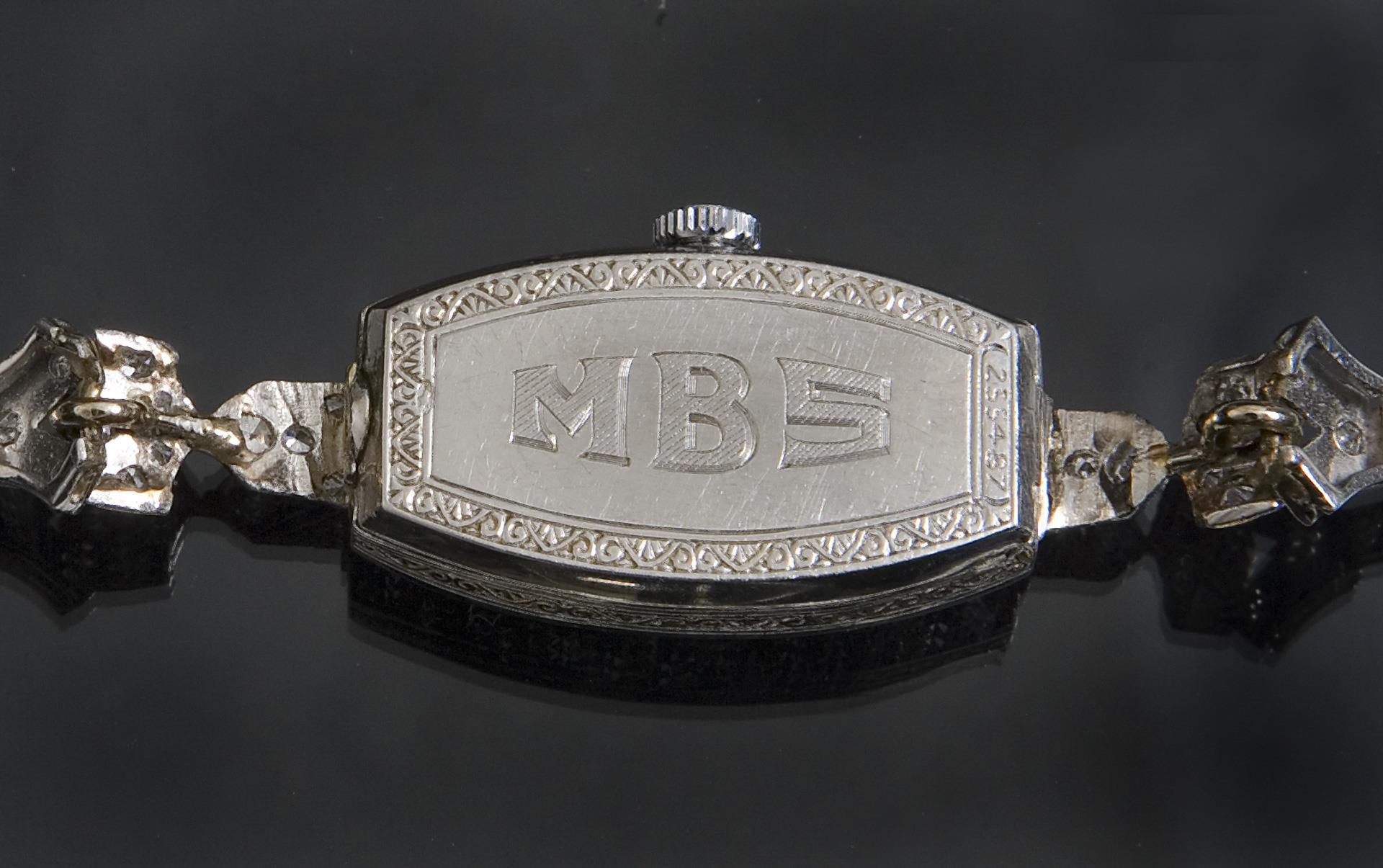 Das Original-Uhrwerk wurde entfernt und ein Quarzwerk eingebaut. Gehäuse rückseitig mit graviertem Besitzermonogramm MBS. Graziles Band mit Faltschließe. Batterie neu.