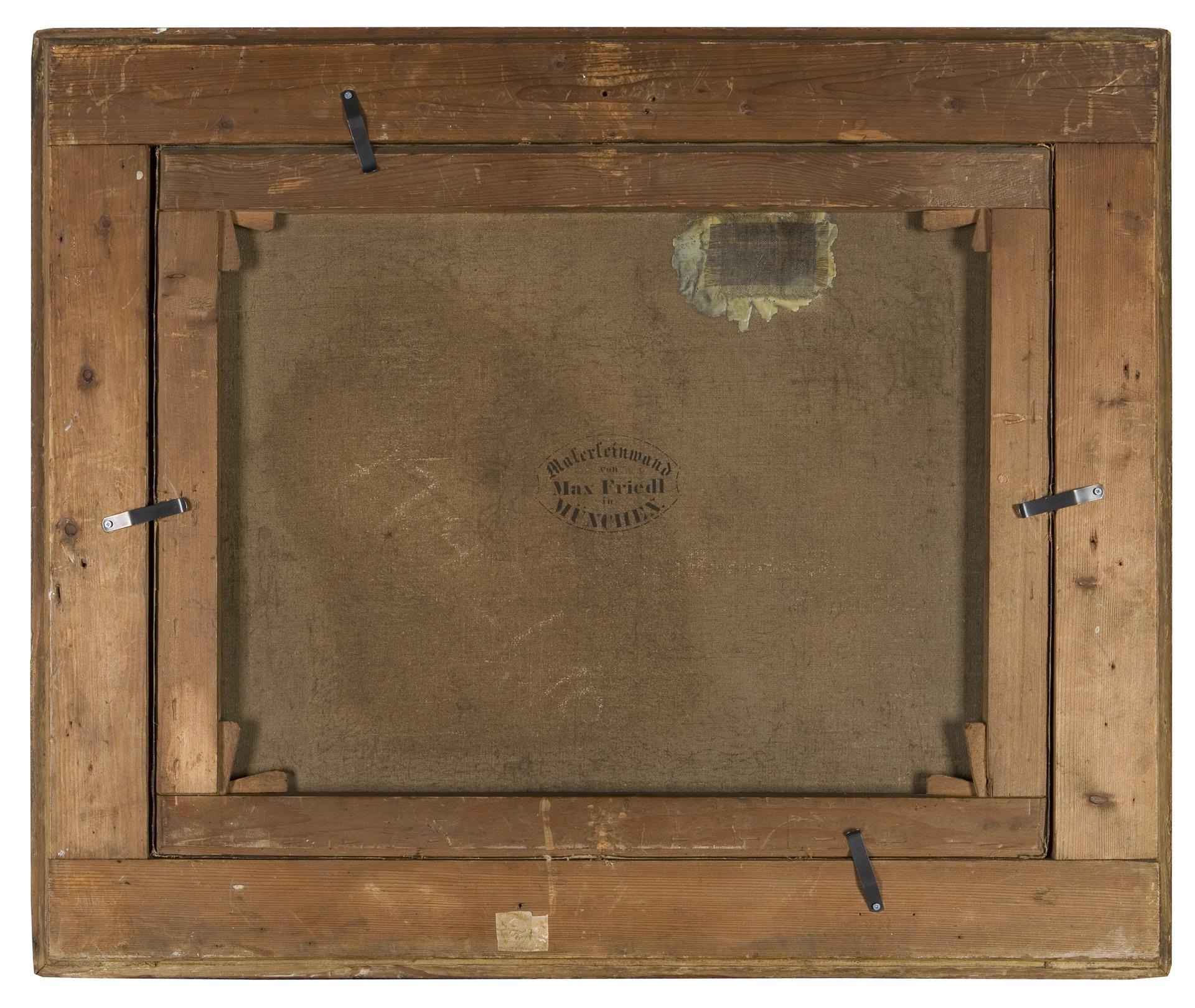 Leinwand mit Münchner Stempel, originaler Keilrahmen, originaler vergoldeter Stuckrahmen. Rückseitig oben ein Flicken.