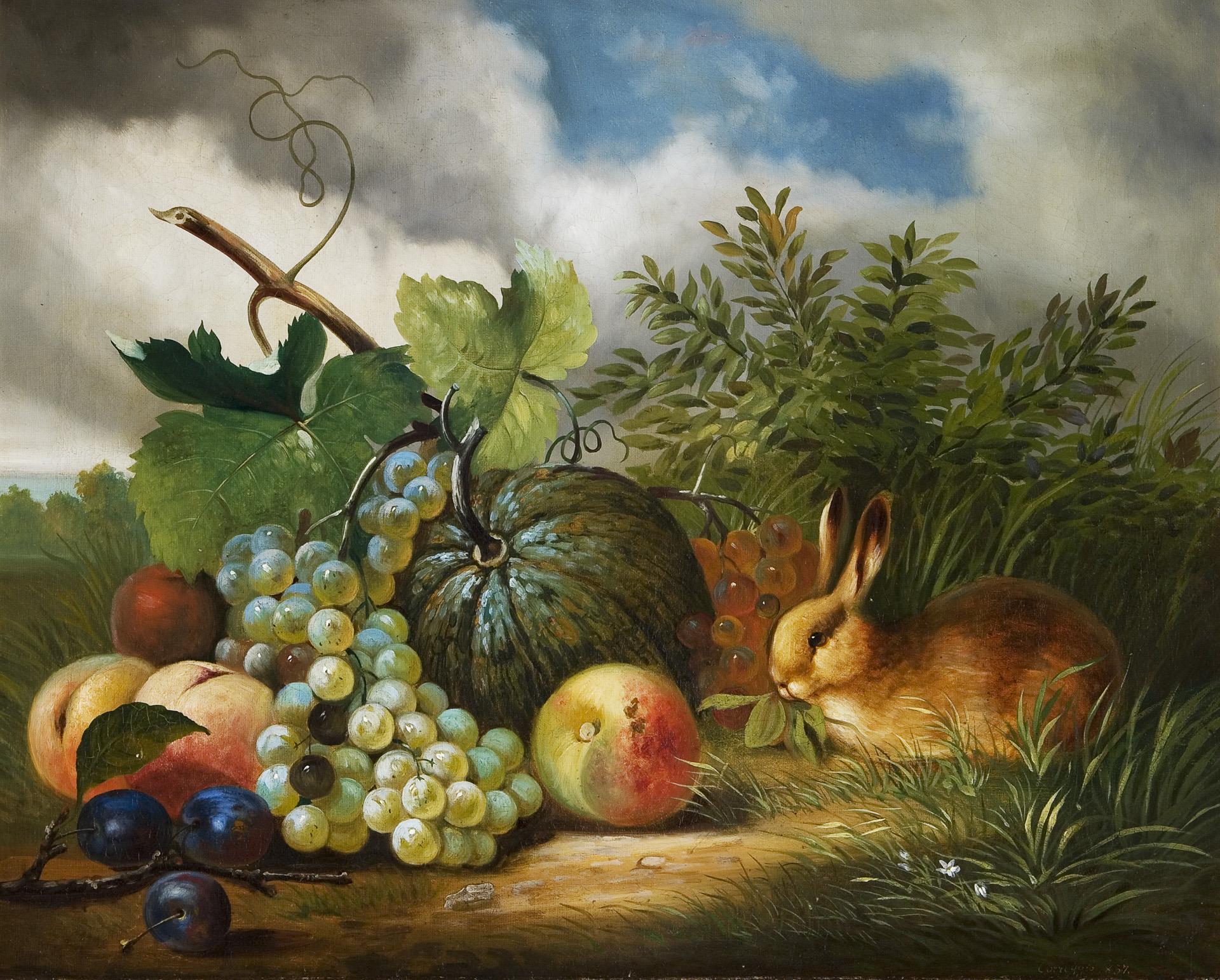 Früchtestillleben mit Kaninchen vor Landschaft