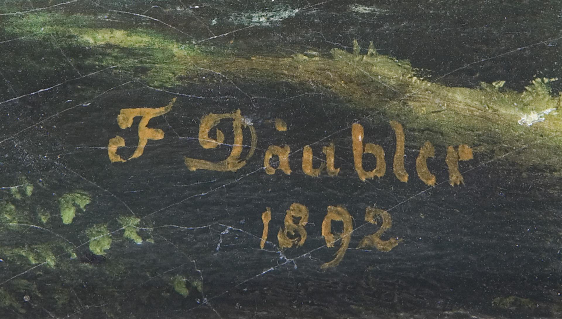 Romantischer, fein gemalter effektvoller Landschaftsausschnitt, signiert: F. Däubler. Profilierter Waschgoldrahmen. Rückseitig oben ein Flicken, Craquelé.