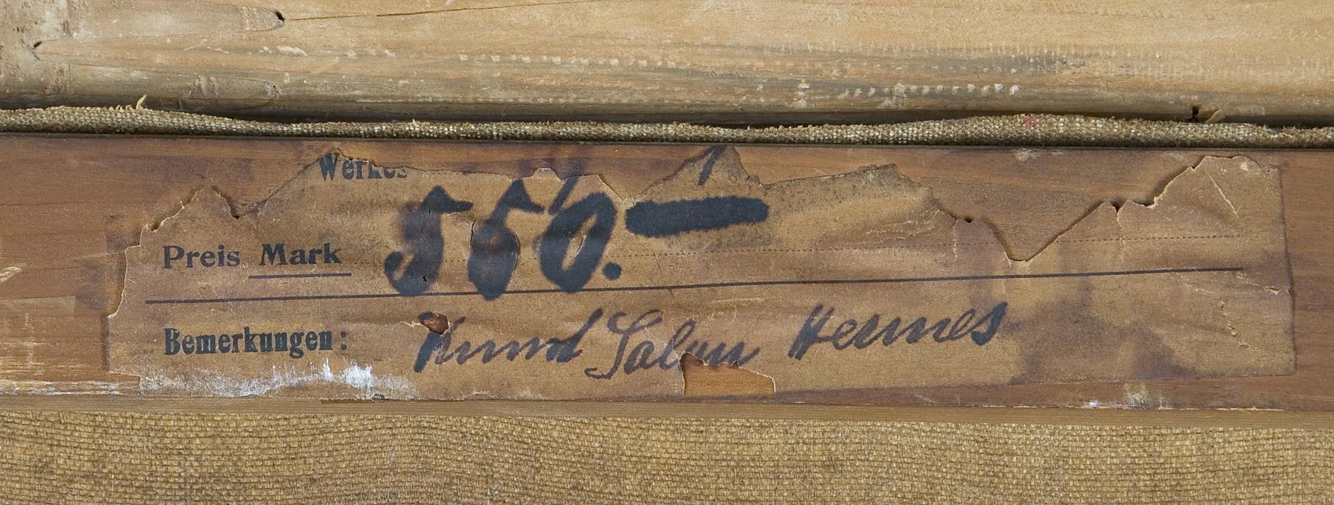 Originaler Keilrahmen mit altem Klebezettel: Kunst Salon Hermes, profilierter Goldrahmen mit weiß gefasster Leiste. Rückseitig ein Flicken.