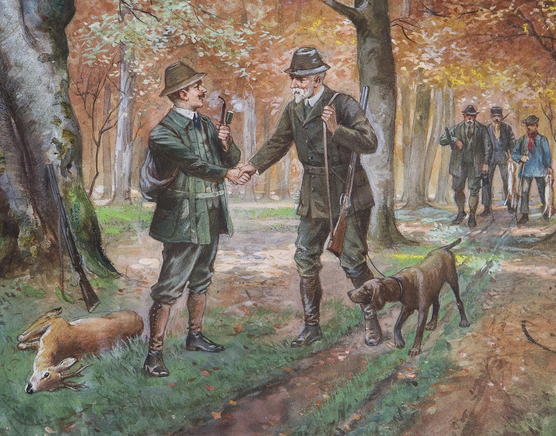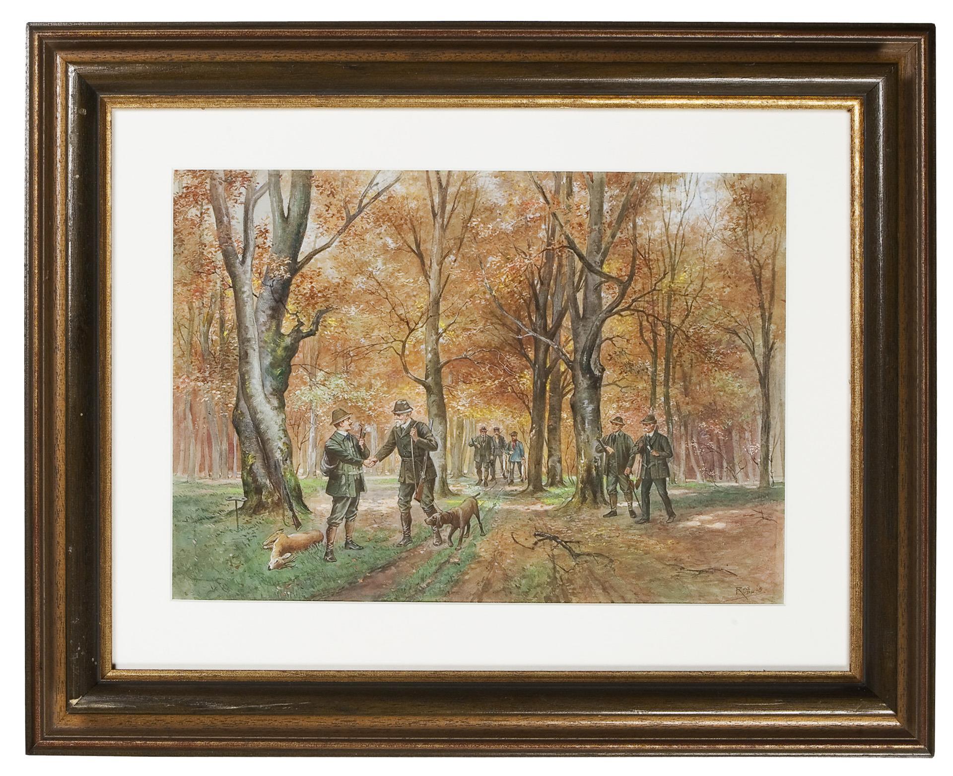 Fein gemalte figurenreiche Genreszene unter herbstlichen Bäumen. Passepartout, neuwertiger verglaster Rahmen.
