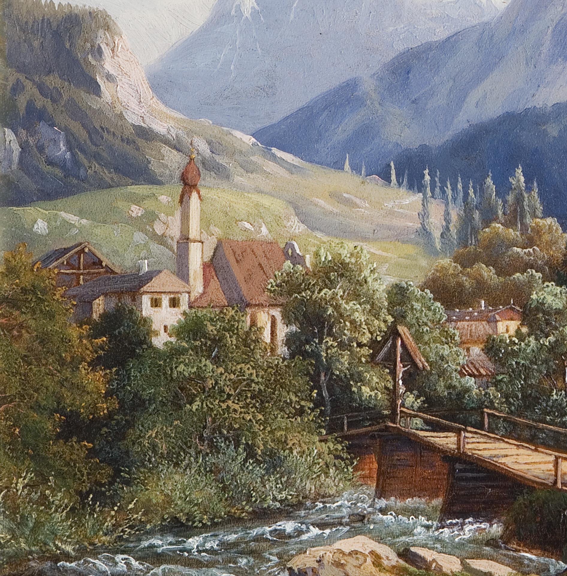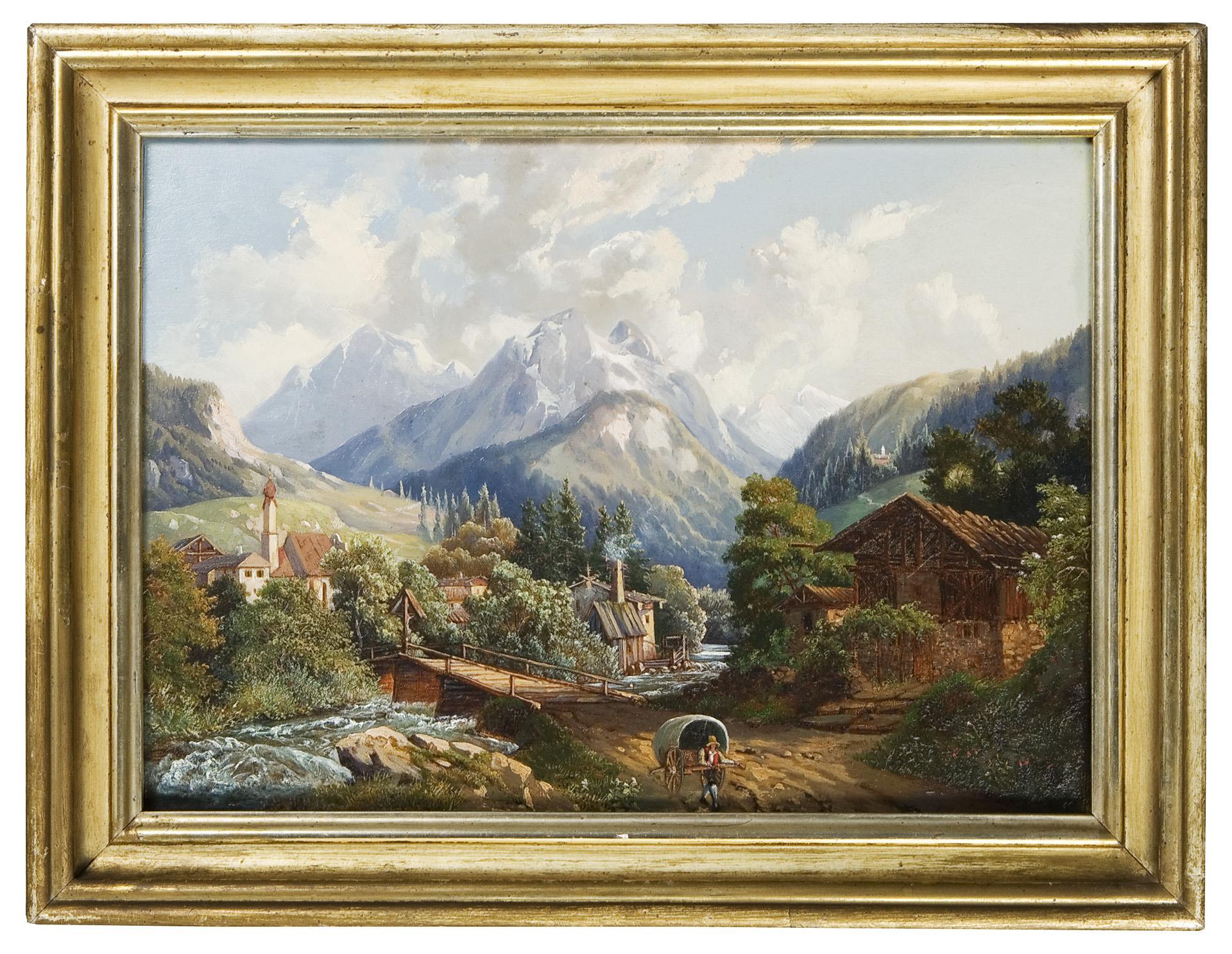 Kleinformatige romantische Ansicht der Pfarrkirche Sankt Sebastian in Ramsau bei Berchtesgaden im oberbayrischen Landkreis Berchtesgadener Land. Ein weltbekanntes Motiv der Landschaftsmalerei. Ramsau ist das erste Bergsteigerdorf Deutschlands. Profilierter Waschgoldrahmen.