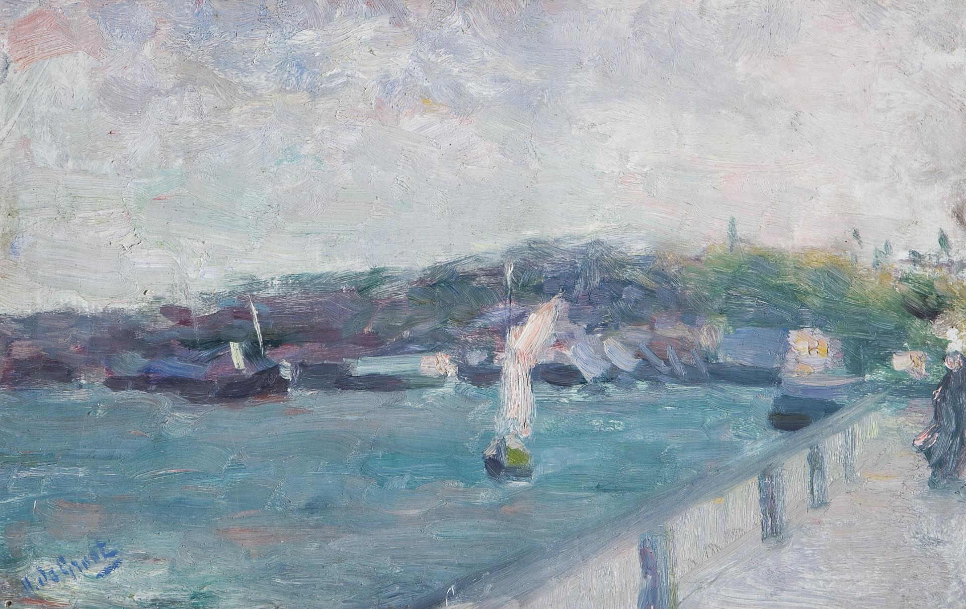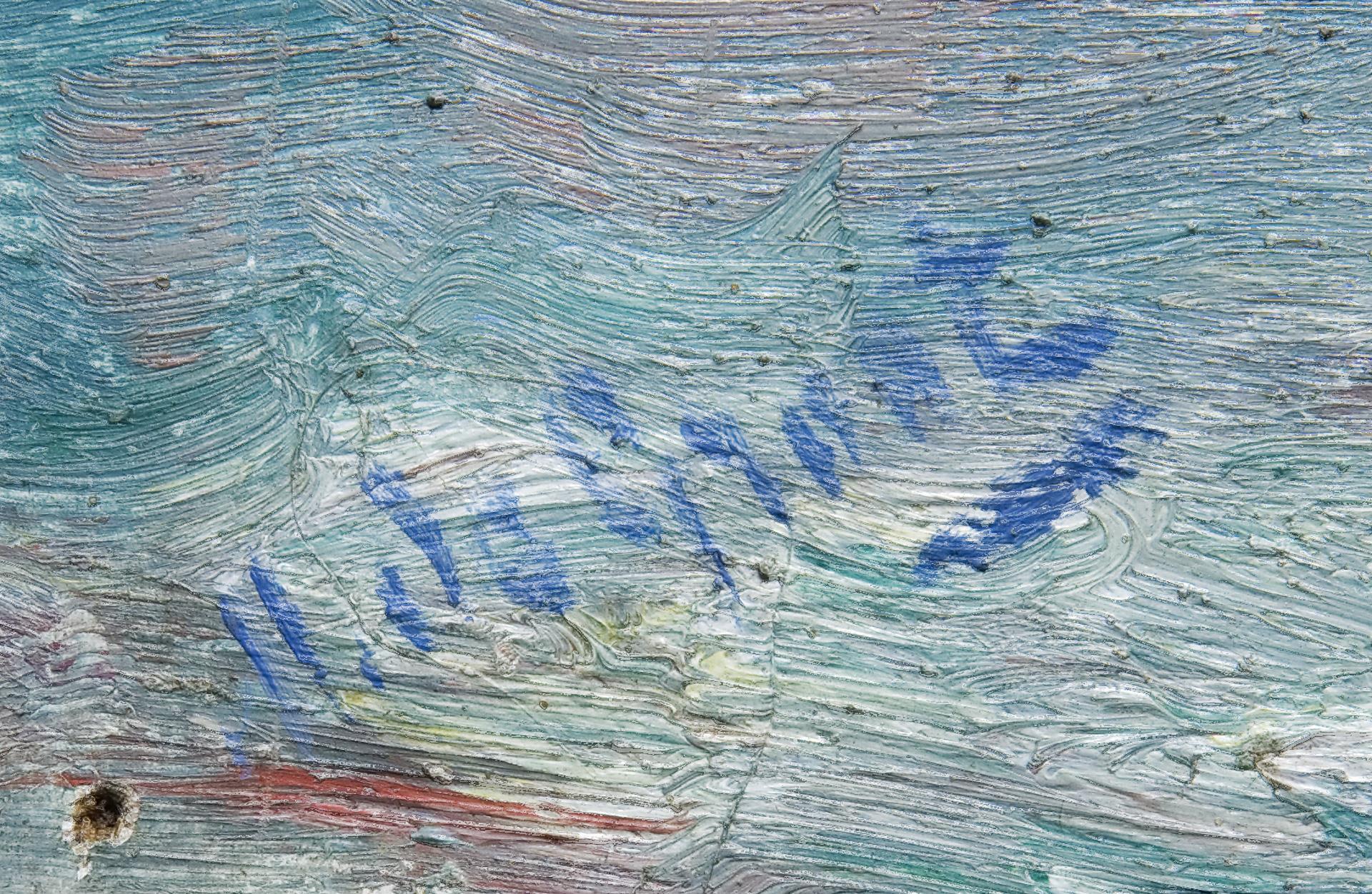 Impressionistisch angelegte Ansicht mit einem schwungvollen Farbauftrag in einer lichten Farbigkeit. Neuwertiger Silberrahmen mit Samt-Passepartout. Leinwand an einem Himmelrand partiell defekt.