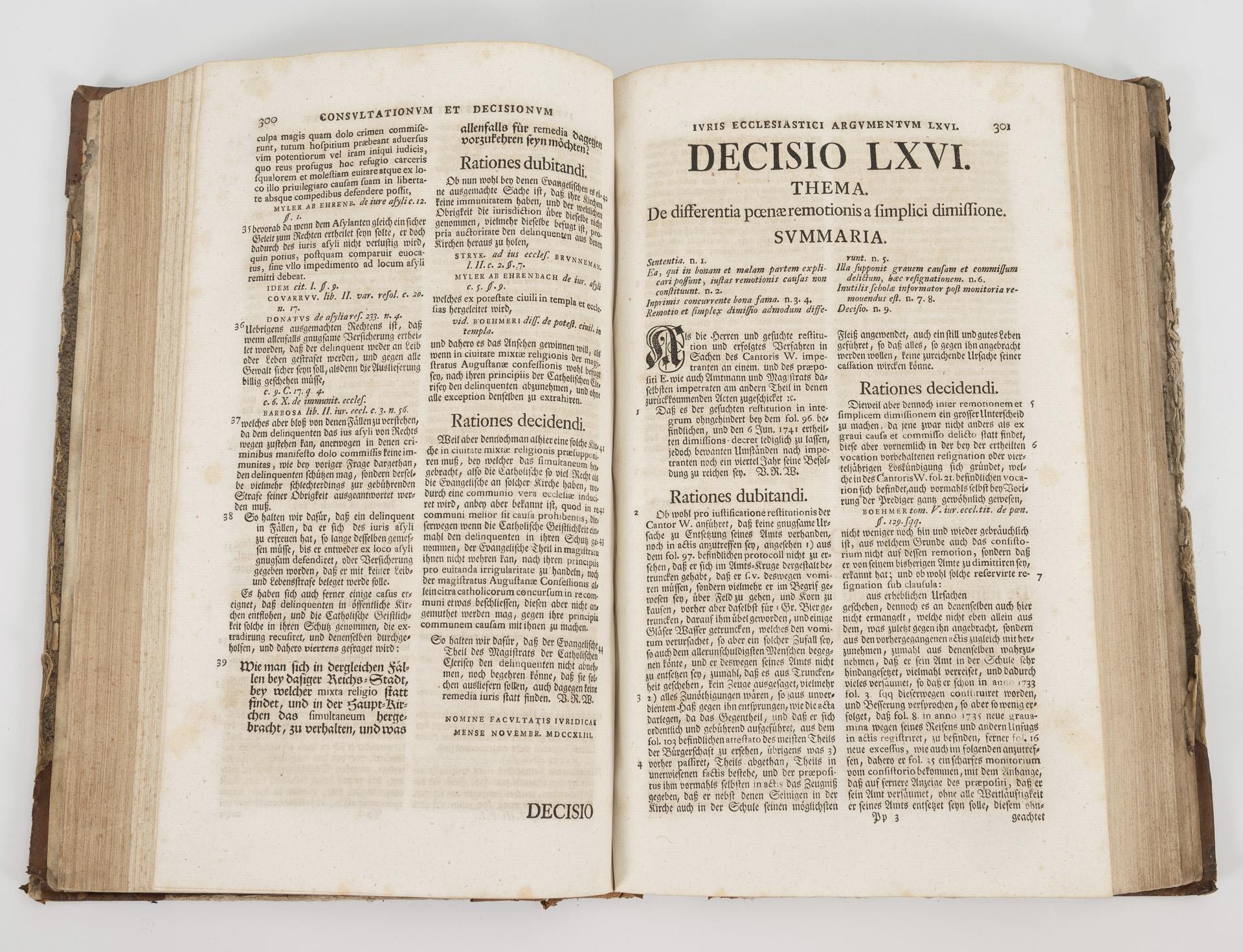 Vortitel und Titelblatt mit Kupferstich, (8), 18, 804 Seiten. Kommentare zur Rechtssprechung in deutscher Sprache. Halbledereinband. Außen stärkere Gebrauchsspuren und Abrieb, Rücken leicht eingerissen, sonst guter Zustand.