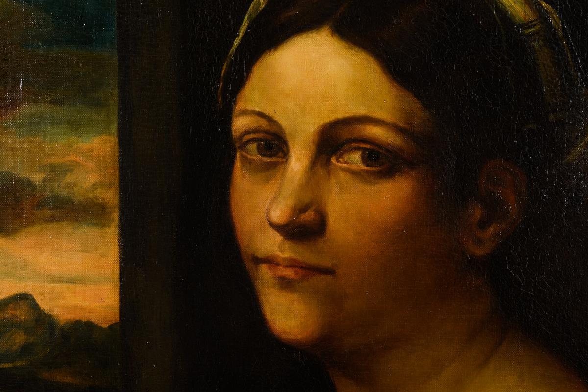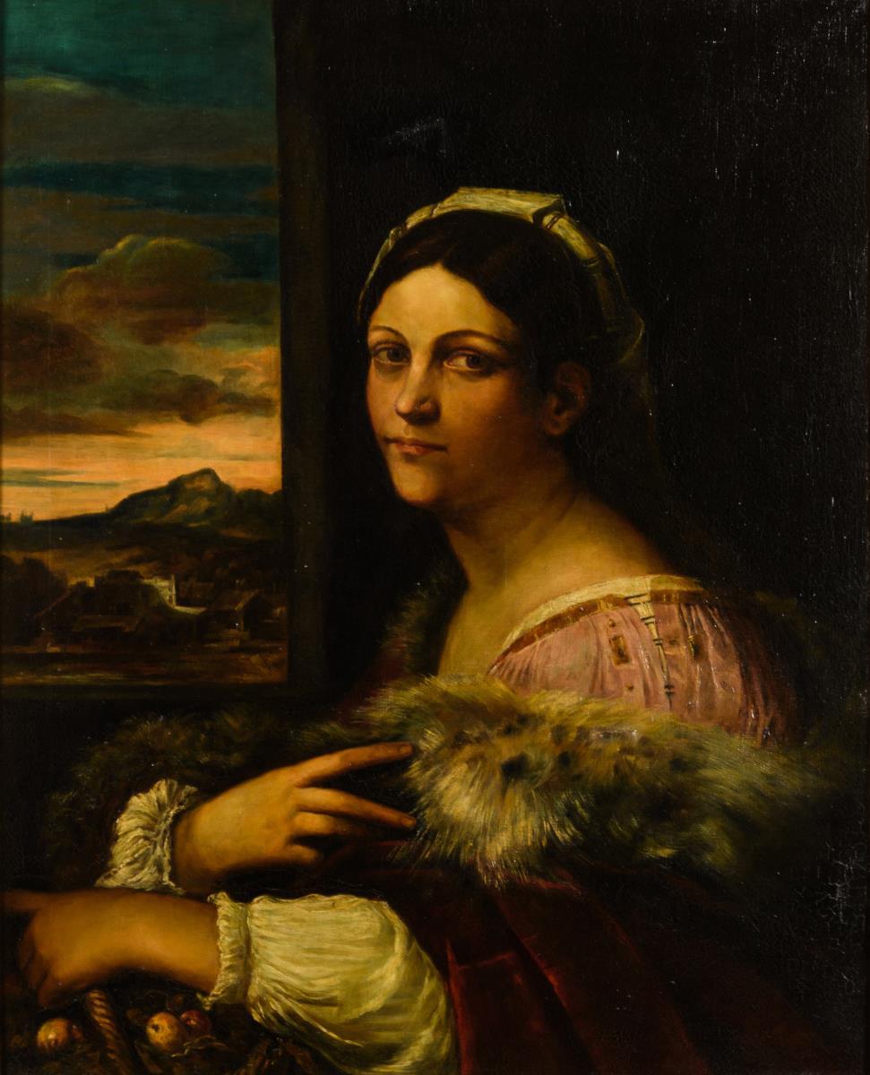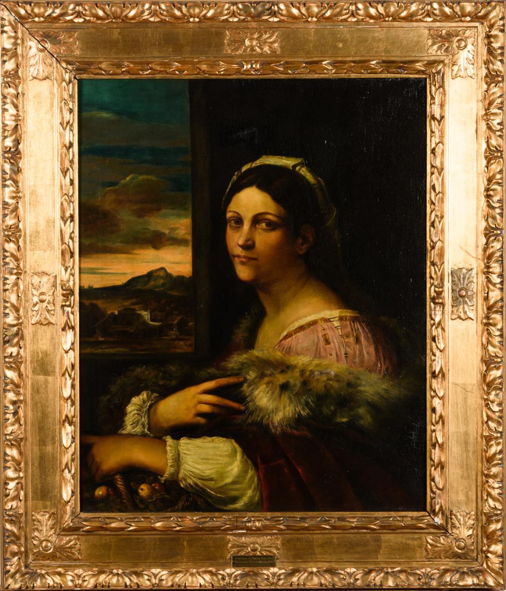 Gute Kopie nach dem Original aus der Berliner Gemäldegalerie, welches um 1512 entstanden ist und eine junge Frau im pelzverbrämten Mantel vor einem Fenster mit Blick in die Landschaft zeigt. Restauriert mit zwei Hinterklebungen.