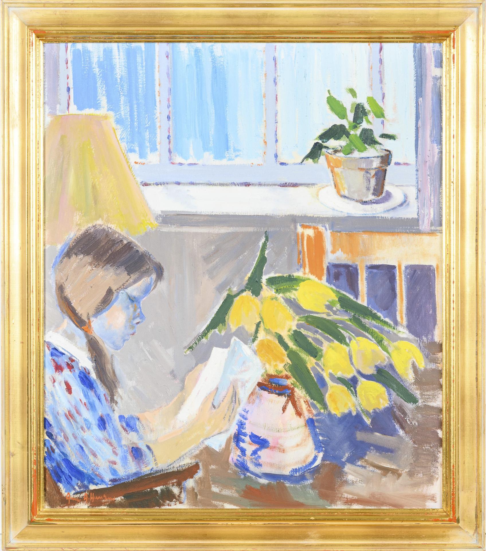 Mädchen, an einem Tisch im Zimmer sitzend, ein Buch lesend.