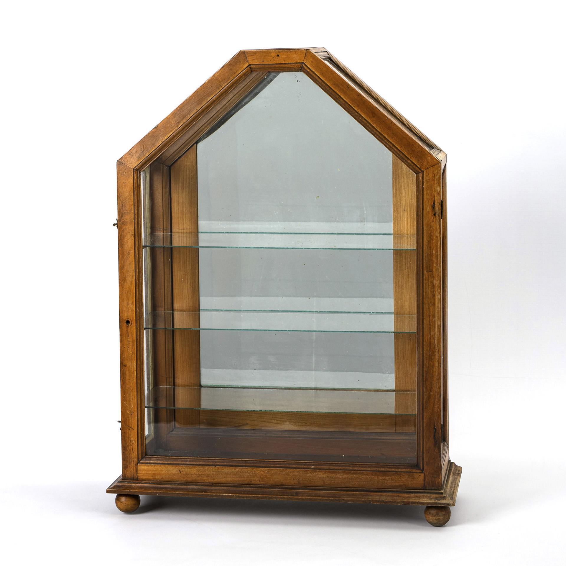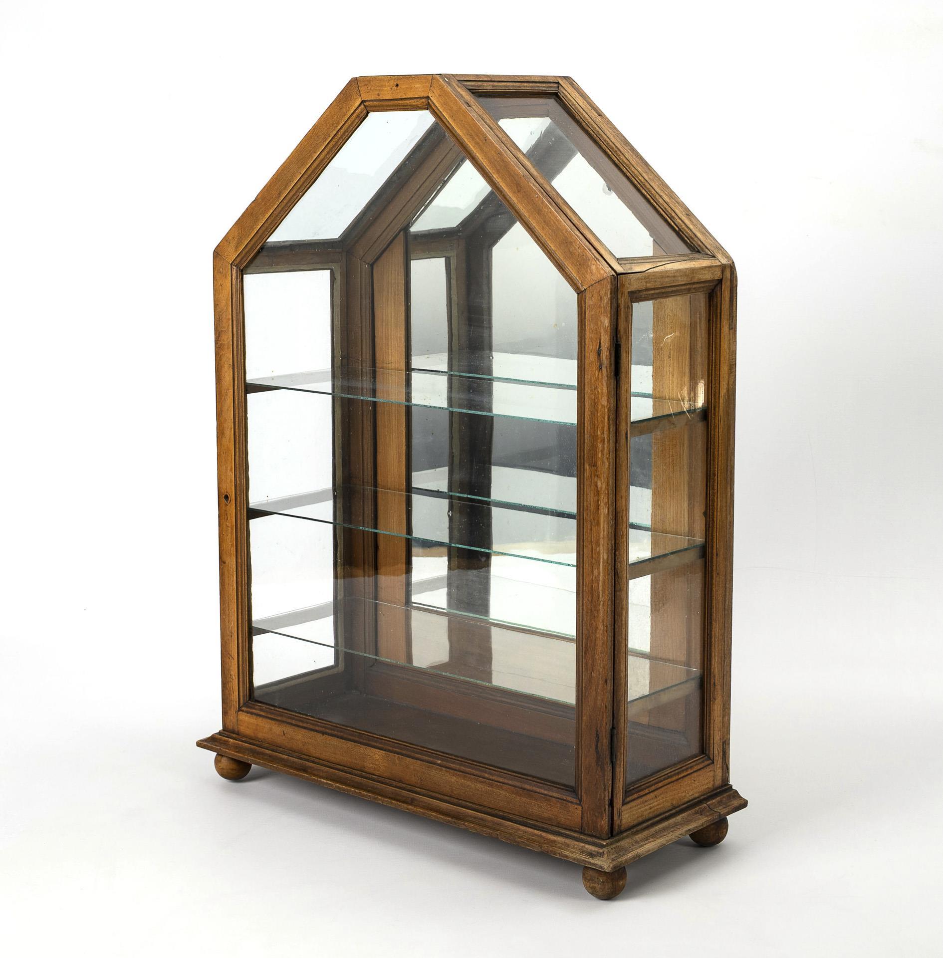 Auf Kugelfüßen stehender, allseits verglaster Korpus mit Spitzdach, durchgehender Fronttür und 3 Glasböden vor verspiegelter Rückwand. Kleiner Trockenriss am Boden, Türknauf fehlt, einige Alters-/Gebrauchsspuren.