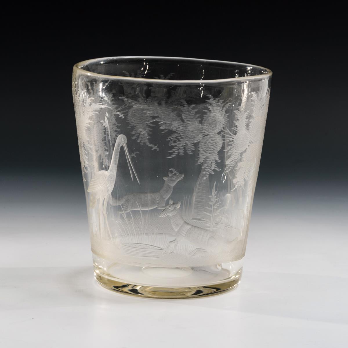 Konische Vase mit der geschliffenen Darstellung der Fabel "Der Fuchs und der Storch", ausgekugelter Abriss.