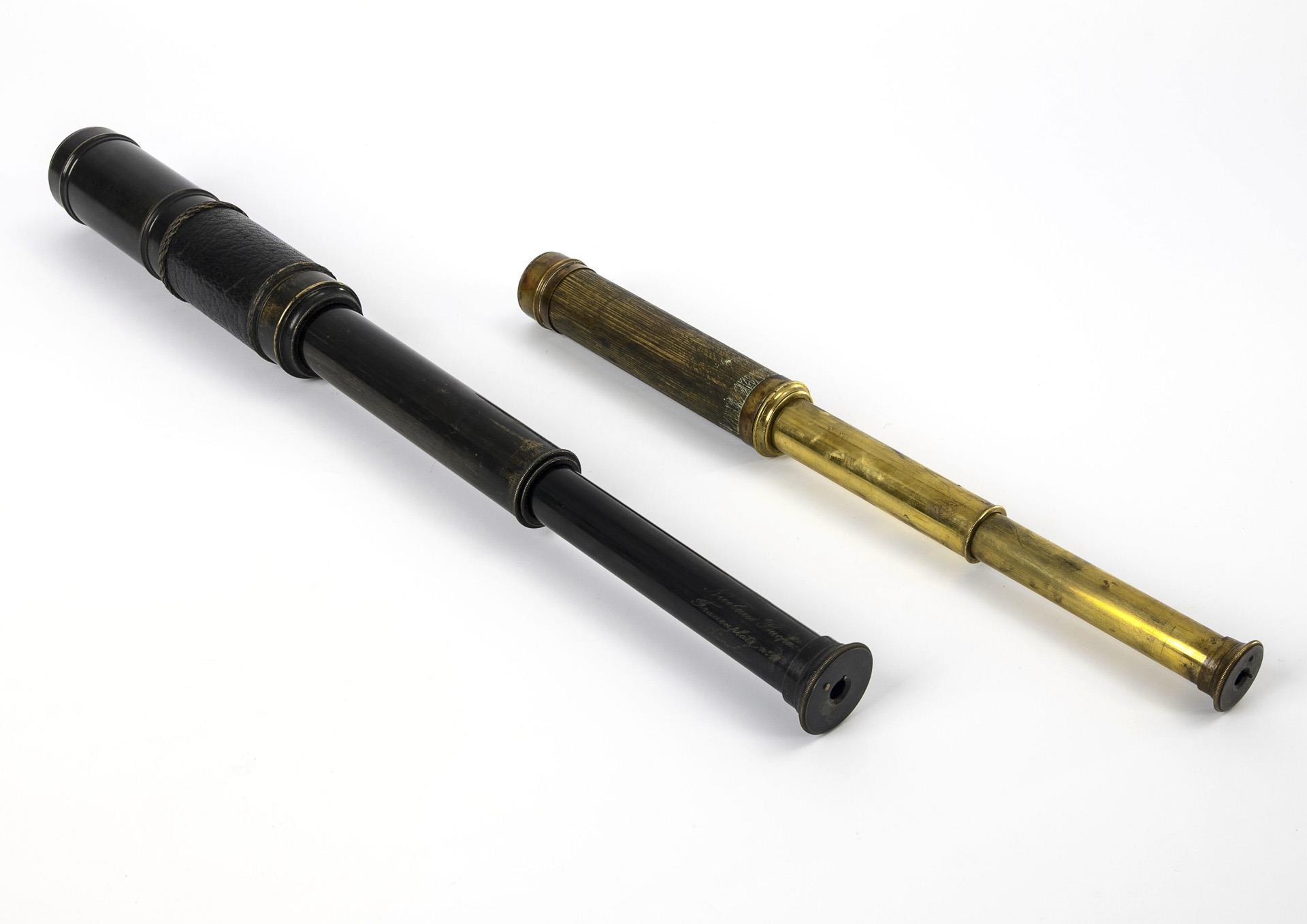Je 2-zügiges Fernrohr; das größere mit Lederbezug und -etui. Je ohne Bild, 1 fehlender Bezug.