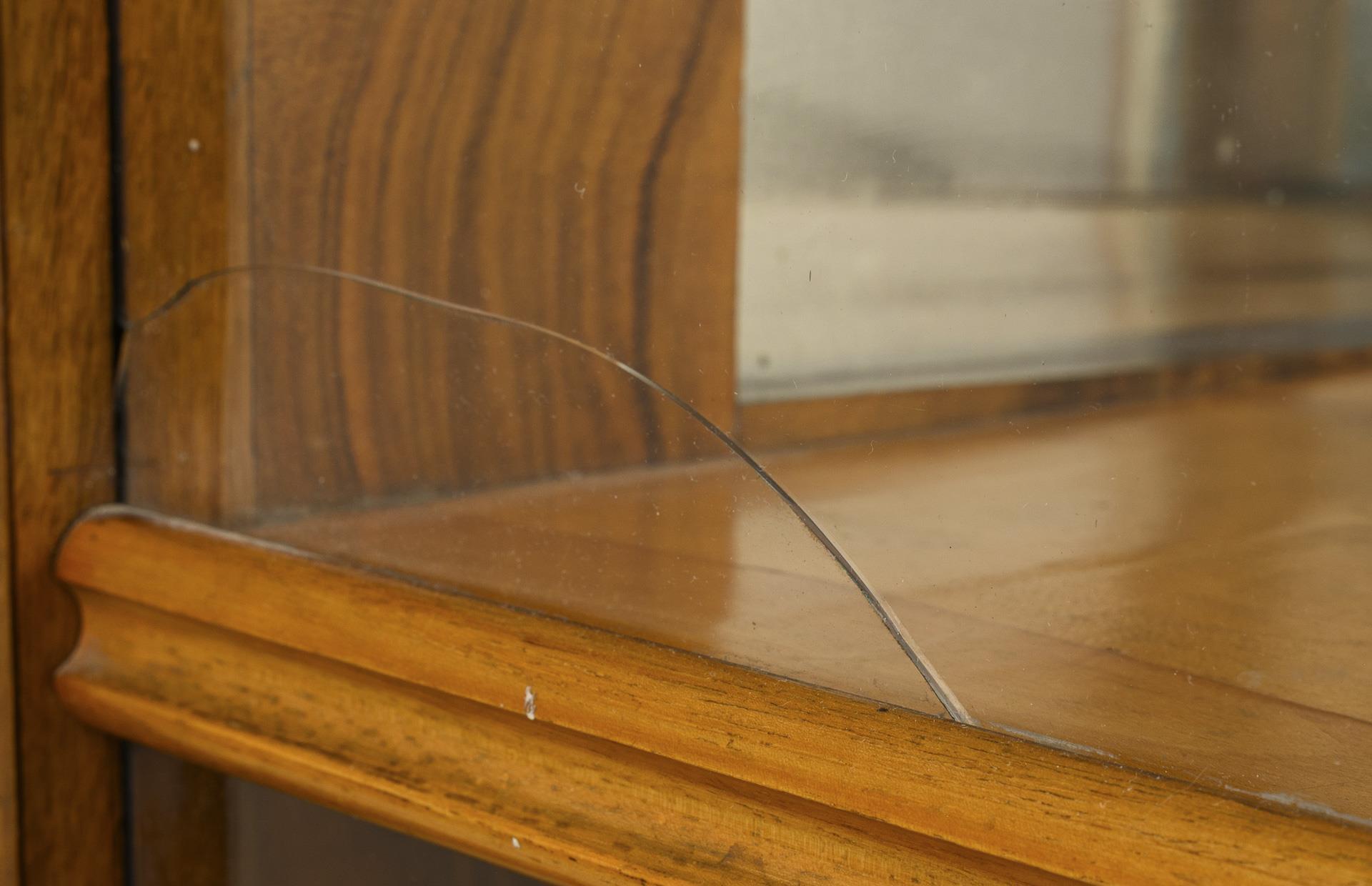 3-seitig verglaster Korpus mit 1 Tür und 1 Sockelschub, auf 4 Drechselfüßen. Spiralförmige Dreiviertelsäulen und Drechselzier, gerundete Profilleisten, geschnitzte florale Applikationen. 1 ebonisierte Schlüssellocheinlage, 1 Schlüssellochbeschlag aus Holz. Innen 3 Ablagefächer und verspiegelte Rückwand. Leichte Alters- und Gebrauchsspuren, 1 Seitenglas gesprungen.