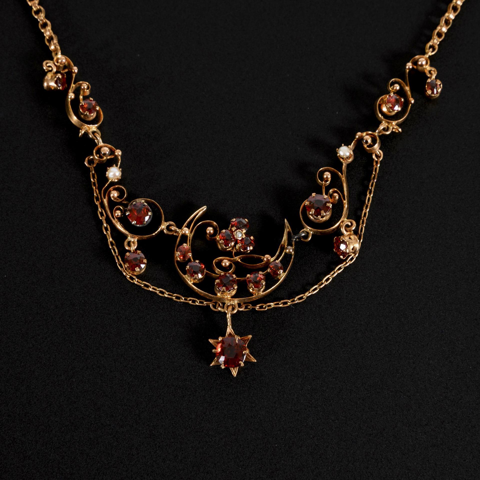 Collier aus der Zeit um 1890, besetzt mit Granaten und kleinen Saatperlen. Alle Abhängungen vorhanden. Rückseitig leichte Bereibungen der Vergoldung.
