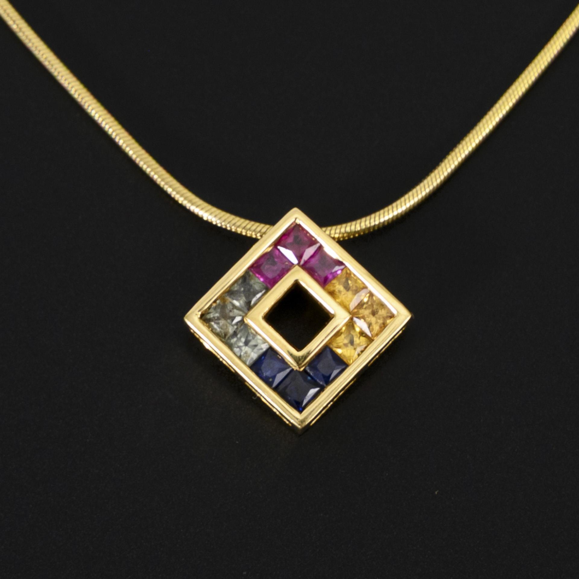 Quadratischer, mittig offen gestalteter Anhänger mit insgesamt 12 Saphir-Carrés in 4 Farben ausgefasst, an einer Schlangenkette.