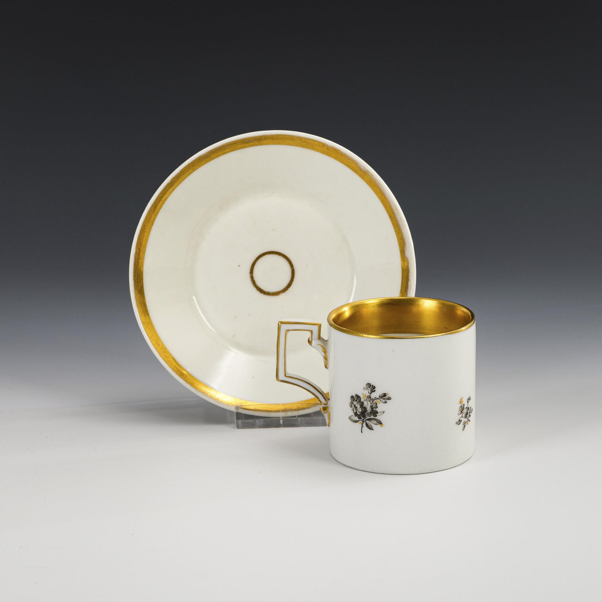 Zylindertasse mit gewinkeltem Henkel. Schauseitig ein kleines, grisaillegemaltes Blumenbukett mit Rose und Mohn, goldstaffiert. Haarriss am unteren Henkelansatz.