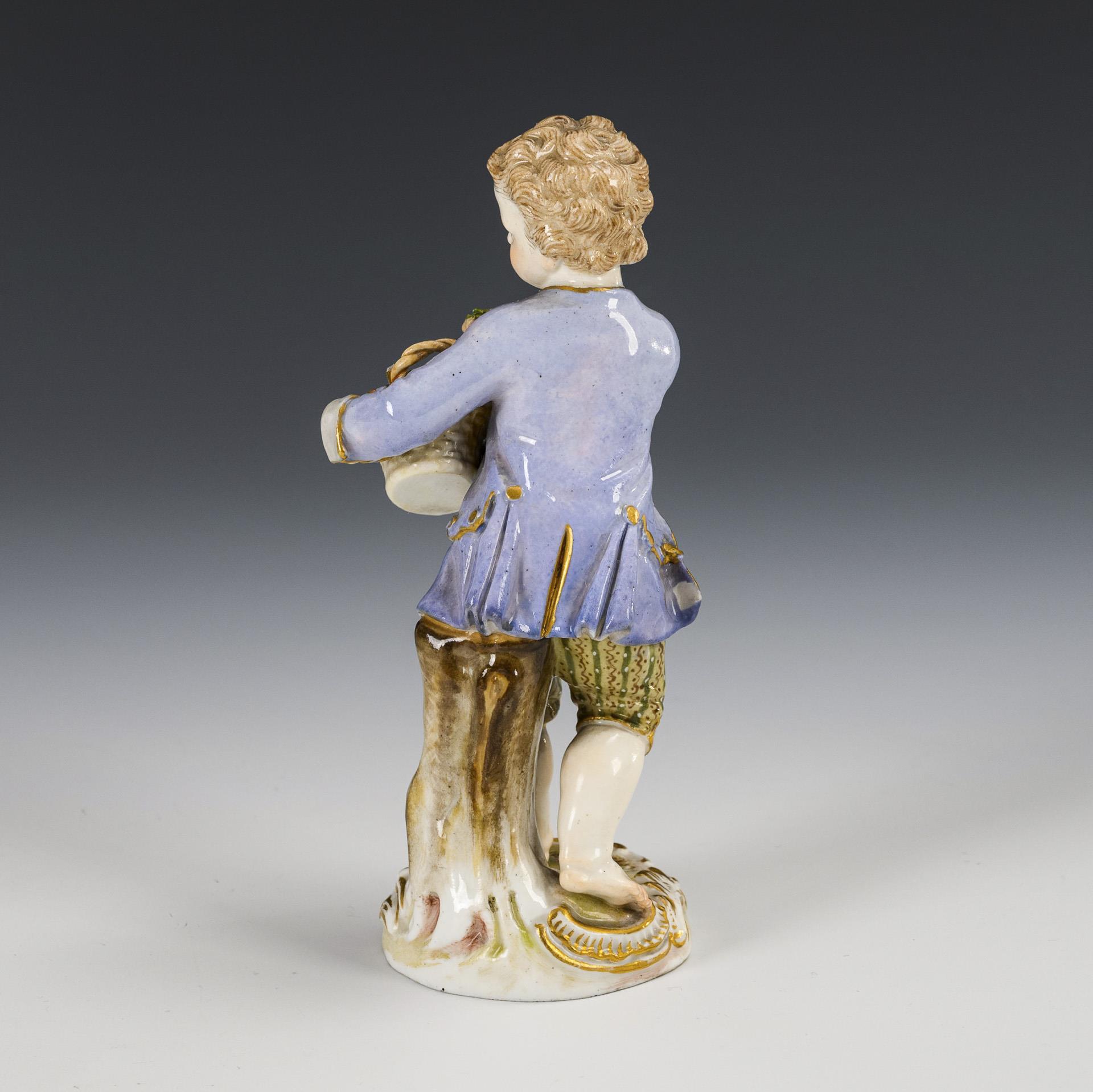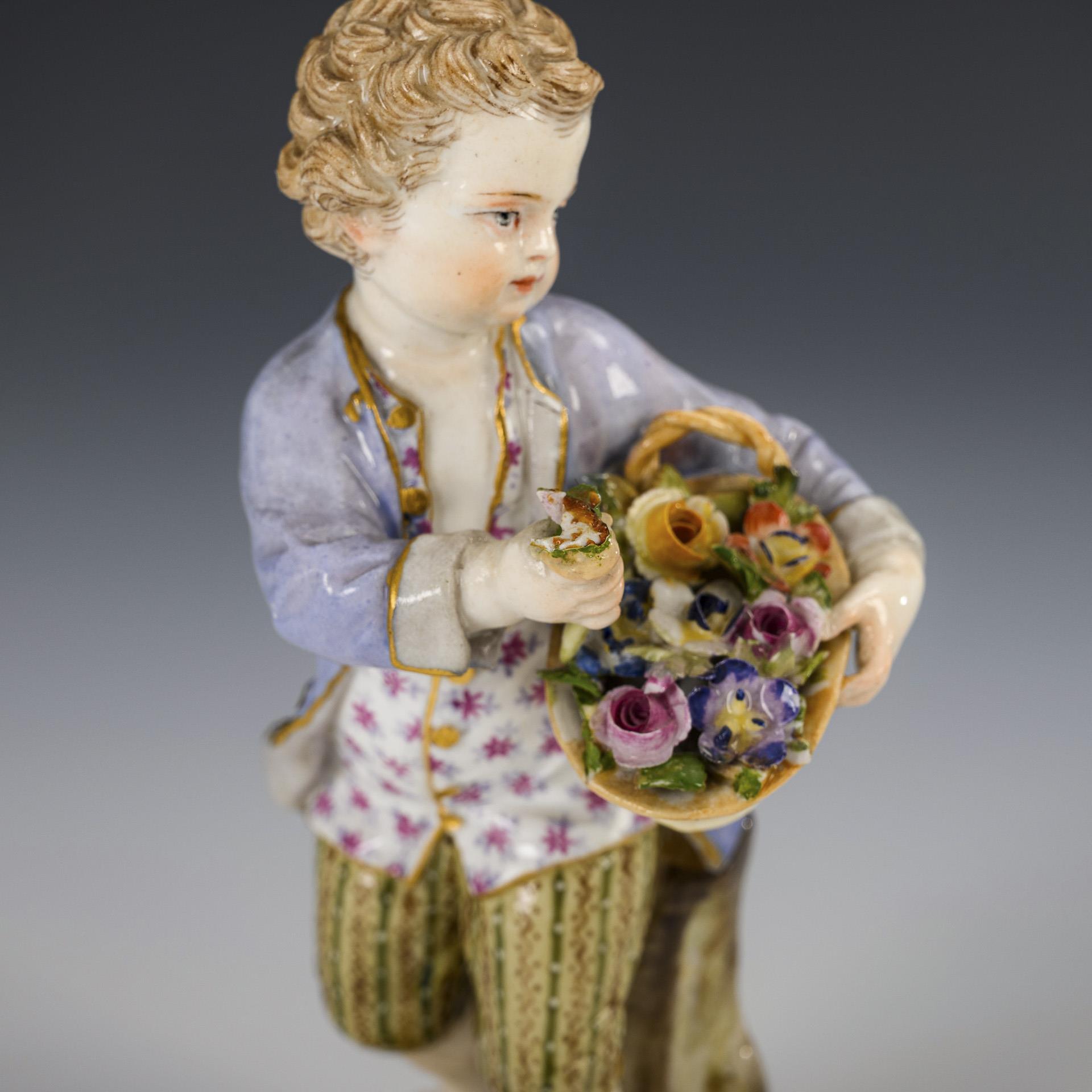 An einem Baumstamm stehender Knabe mit Blumenkorb. Chip am Saum des Gehrockes, Blüten etwas bestoßen, 1 Korbhenkel fehlt, Blüte in der Hand des Knaben bestoßen und mit Leimspuren.