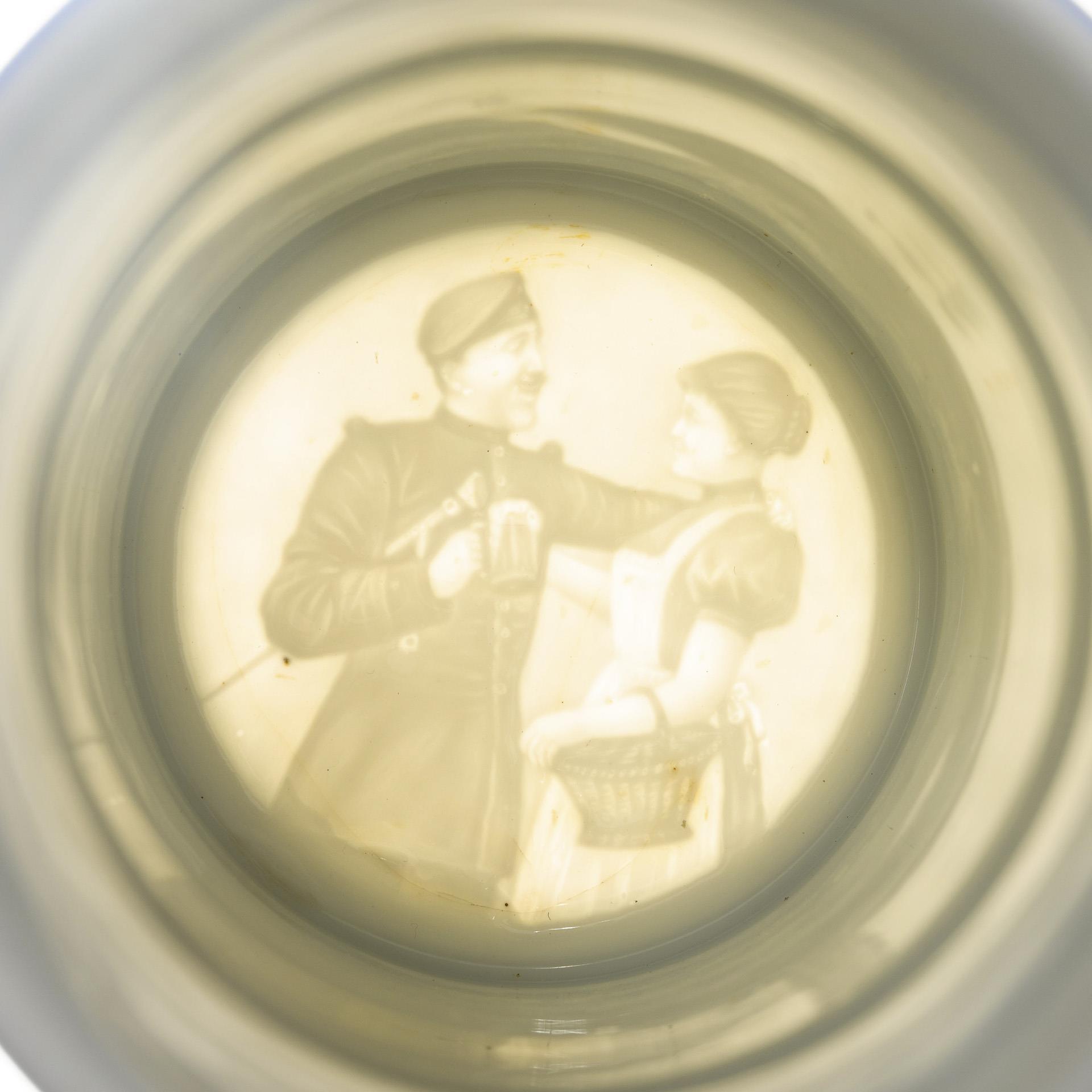 Porzellan mit Bodenlithophanie (Soldat und Mädel), kolorierter Umrissvordruck, Zinn. H 24 cm. 1,0 kg.