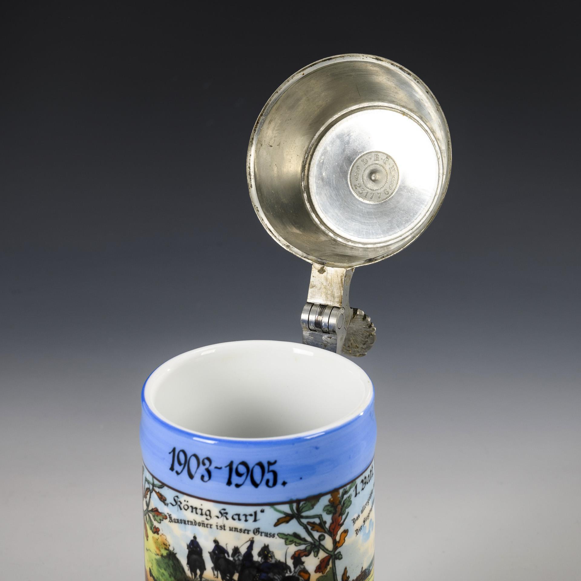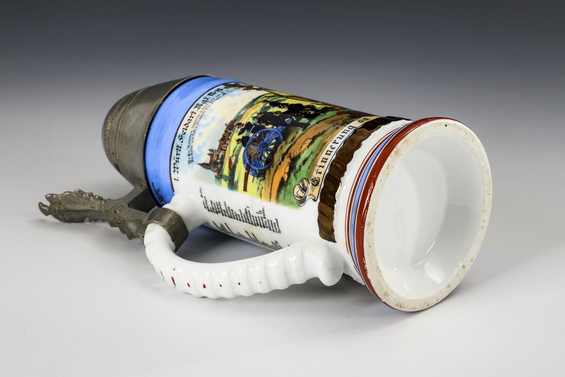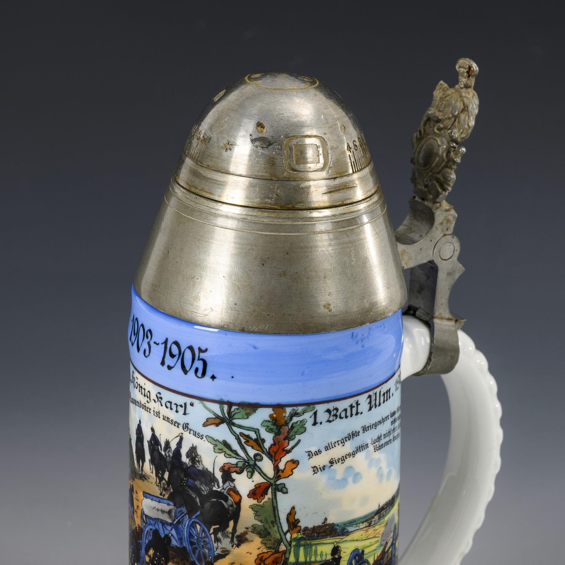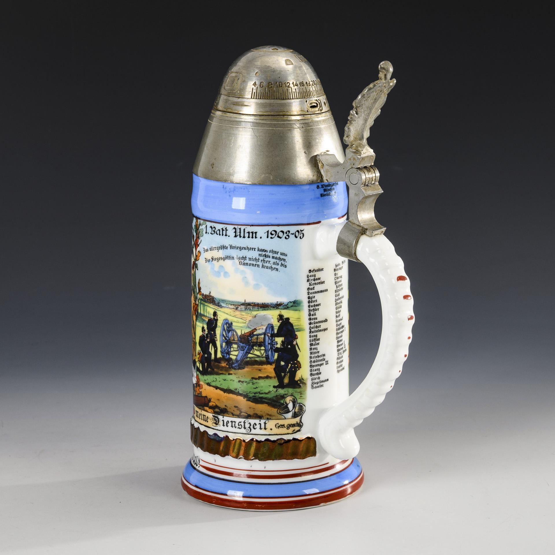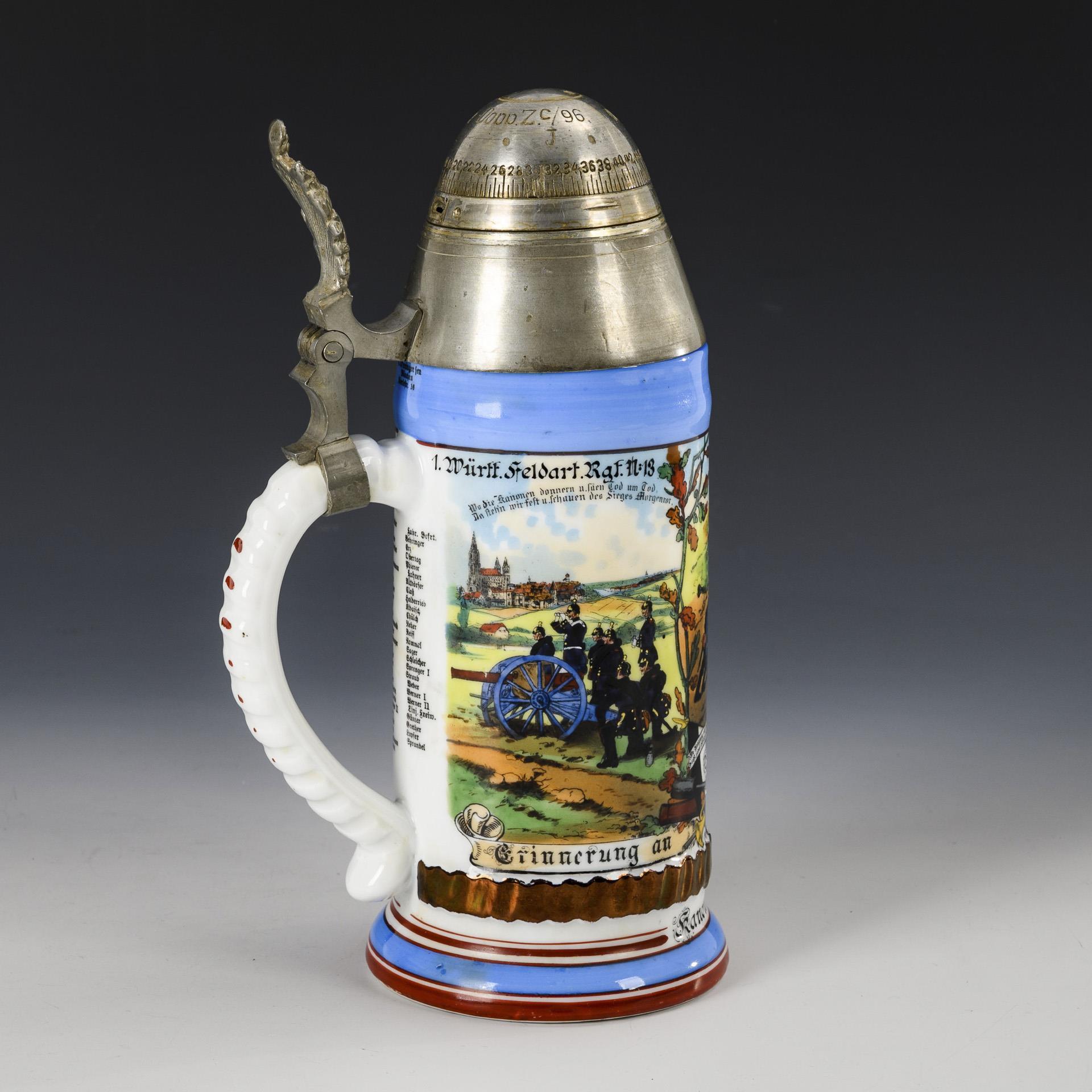 Farbkräftig gemalte Militärszenen mit Landeswappen von Württemberg sowie gedruckte Namensliste. "Kanonier Grünenwald", "1. Württ- Feldart. Rgt. N: 13 'König Karl', 1. Batt.". Zinndeckel in Form eines Granatenkopfes mit Allegorie-Drücker; abschraubbarer Zünder mit losem Stellring. Rissspinne wohl nur in der Bodenglasur.
