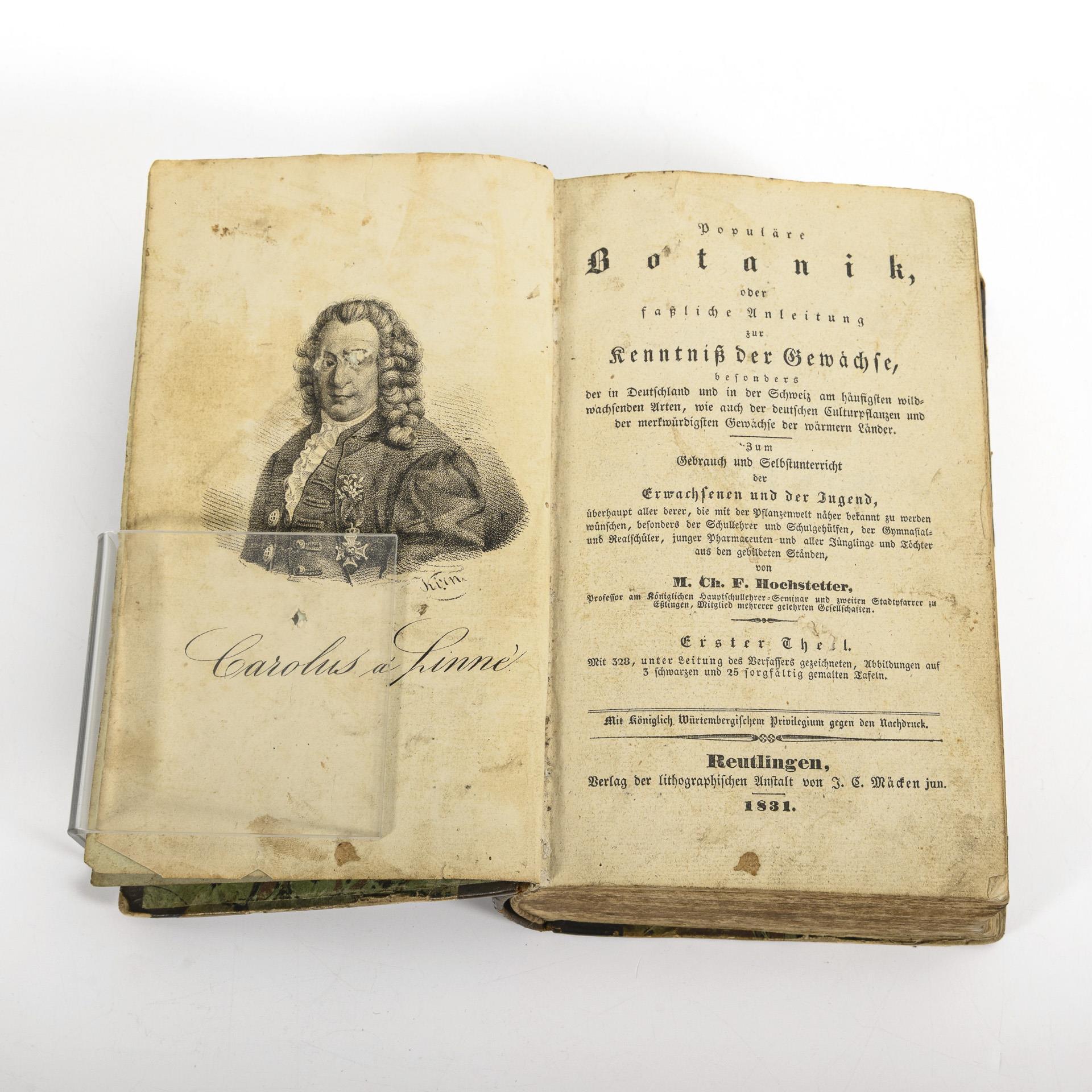 Porträtkupfer (berieben), Titelblatt, (2), 14, 910, (64) Seiten, 2 Tafeln. Mit Beschreibung der Pflanze, tabellarischer Blütenkalender, "Schlüssel der Gattungen" Verzeichnis nach Aufbaukriterien sortiert und Register der deutschen und lateinischen Namen. Im Halbledereinband. Alle Tafeln fehlen, bis auf Nr. 1 und Nr. 2 mit fehlender Ecke. Alters- und Gebrauchsspuren.