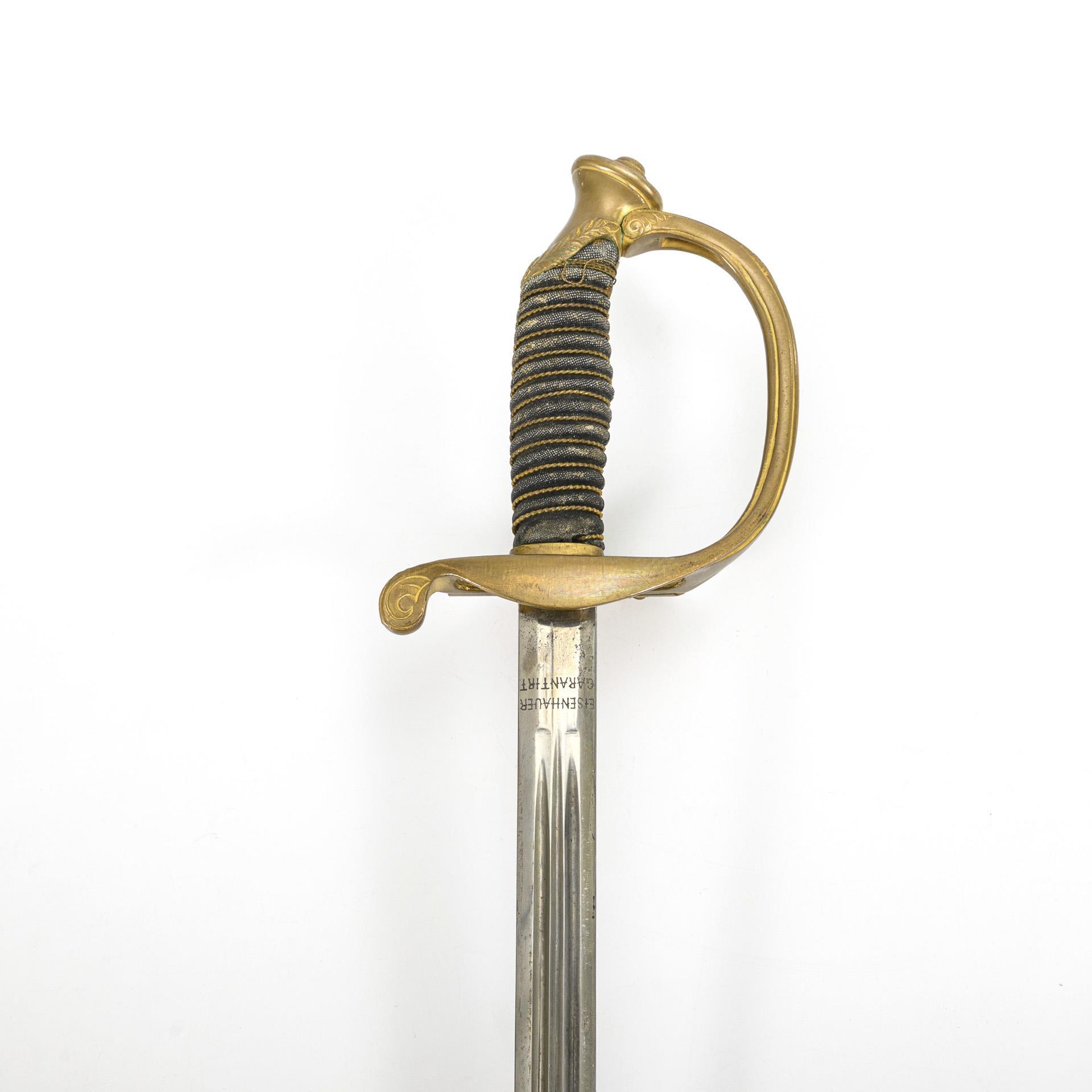 Gerade, einschneidige Klinge mit Spitze in der Mittellinie und zwei schmalen Hohlschliffen. Bekröntes Monogramm "AR" auf der Klinge. Messinggriff mit klappbarem Stichblatt und dort im durchbrochen gearbeiteten Muster das sächsische Wappen. Angewinkelter Knauf, Griff mit Fischhaut und feiner Drahtwicklung. Schwarze Metallscheide mit einem Tragering, Lackierung teils stärker berieben.