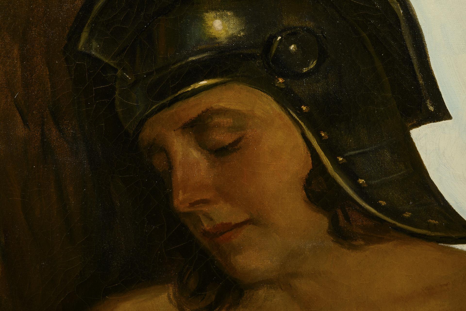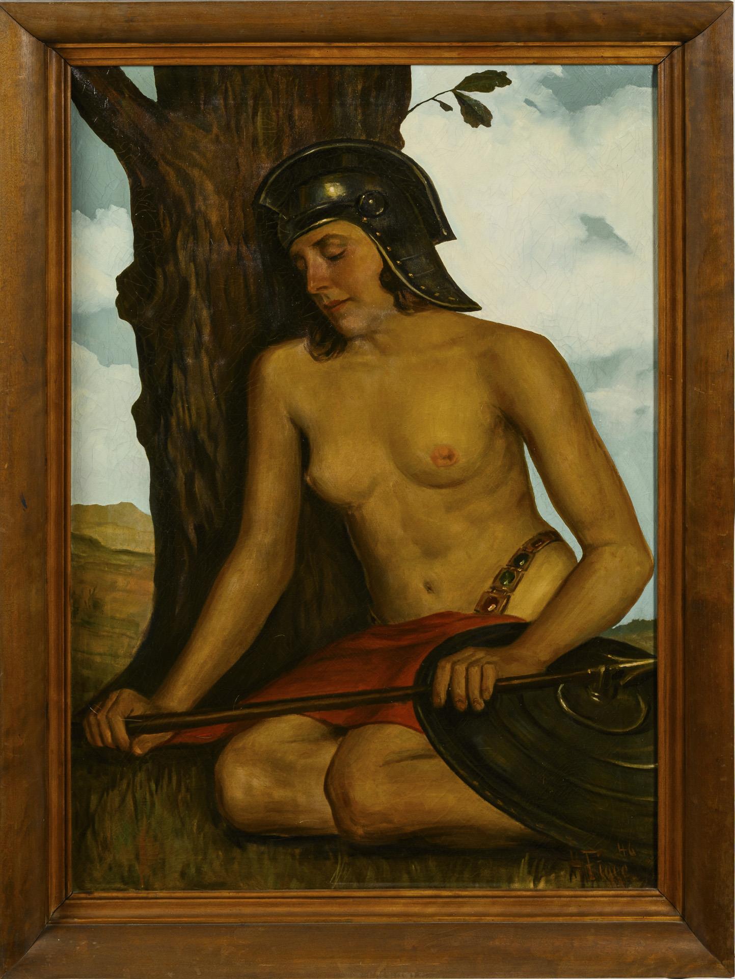 Nackte Kriegerin mit Schild, Speer und Helm an einem Eichenbaum unter wolkigem Himmel. Altersspuren.