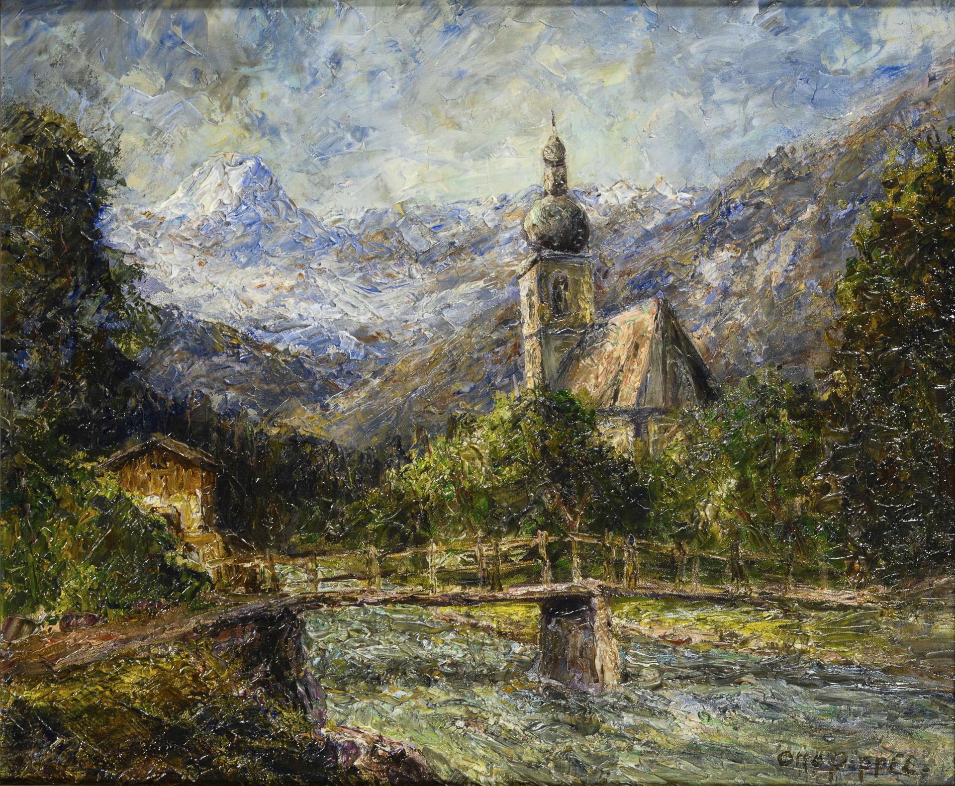Gebirgslandschaft mit Flusslauf und einer Holzbrücke vor der Kirche mit Blick zum Berg.