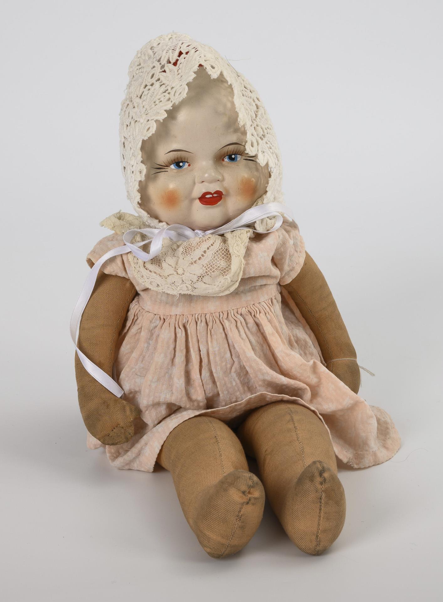 Drehbarer Kopf aus Masse, mit 3 verschiedenen Gesichtsausdrücken (schlafend, lachend und weinend). Holzwollegestopfter Stoffkörper mit Schlenkergliedern und intakter Stimme. Rosa Kleid, weißes Häubchen. Leichte Altersspuren, Körper etwas verschmutzt.