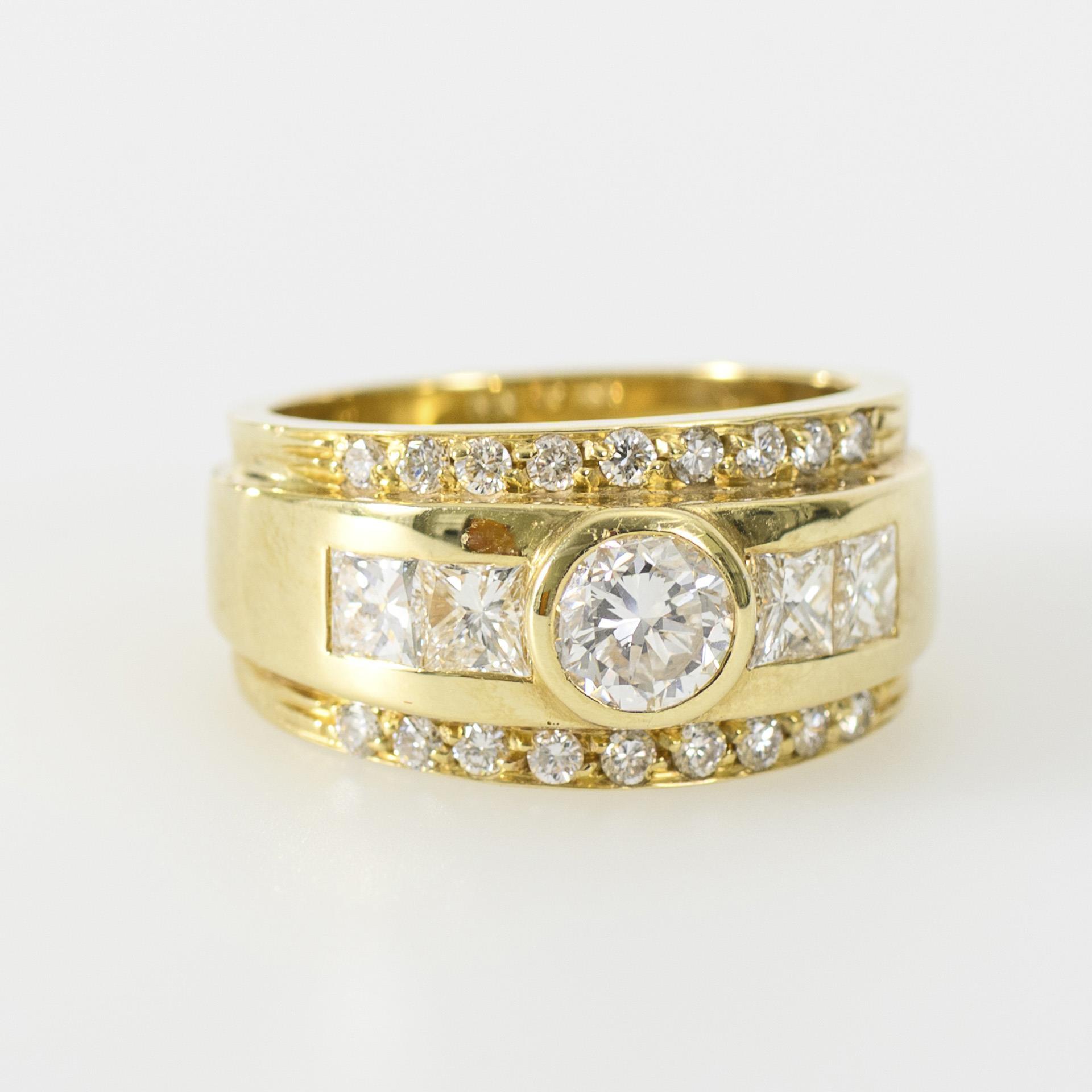 Gelbgold 585 gestempelt, zusätzlich 218 [wohl Brillanten zusammen 2,18 ct] gestempelt. Ringgröße 57; Durchmesser des zentralen Brillanten (in Fassung gemessen) 0,6 cm. 12,1 g.