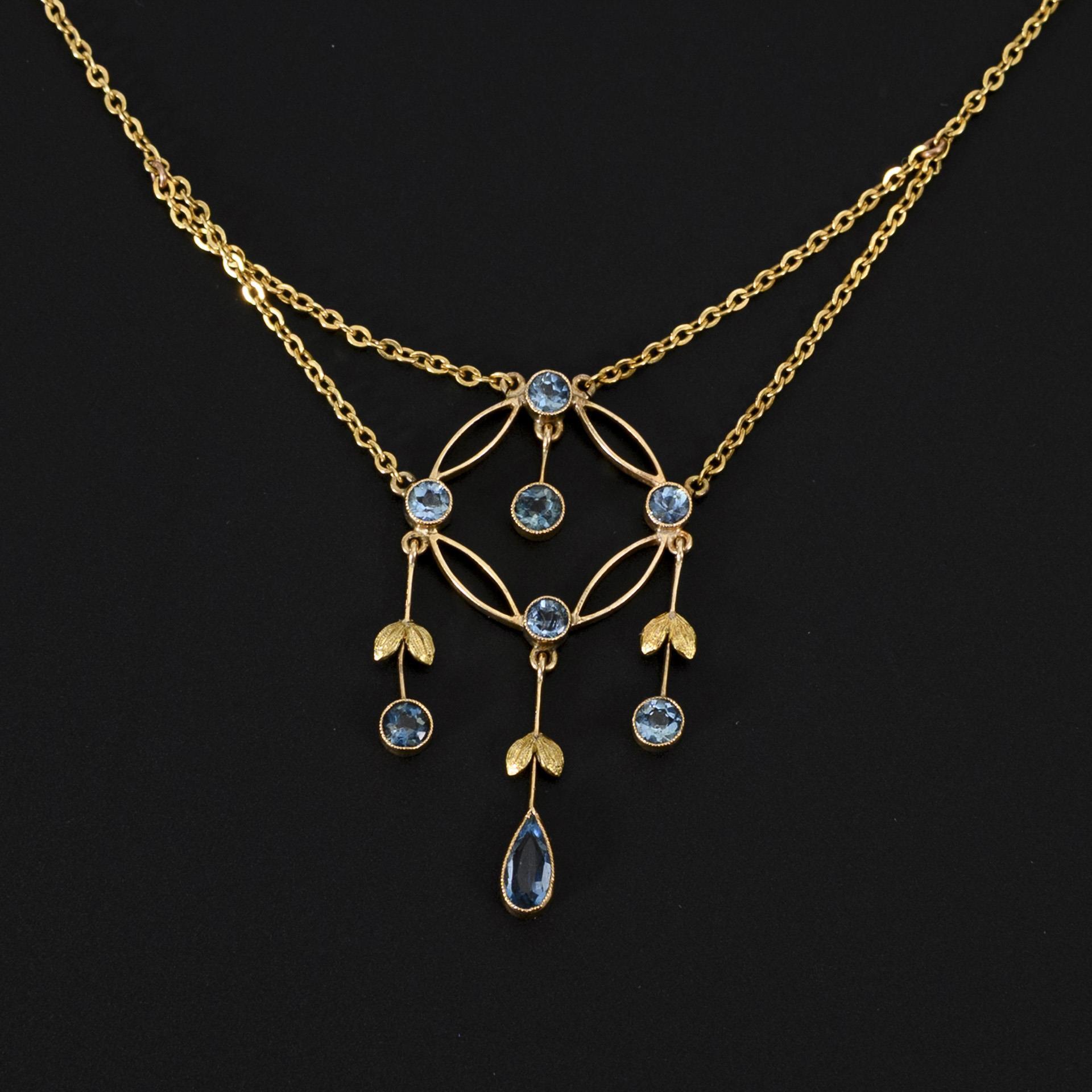 Filigran-detailfreudig gestaltetes Jugendstil-Collier mit blauen Farbsteinen, wohl Blautopase, teils in floral interpretierten Abhängungen gefasst. Die Kettenelemente vermutlich eine jüngere, dem Originalentwurf entsprechende Ergänzung zum historischen Anhängerelement.