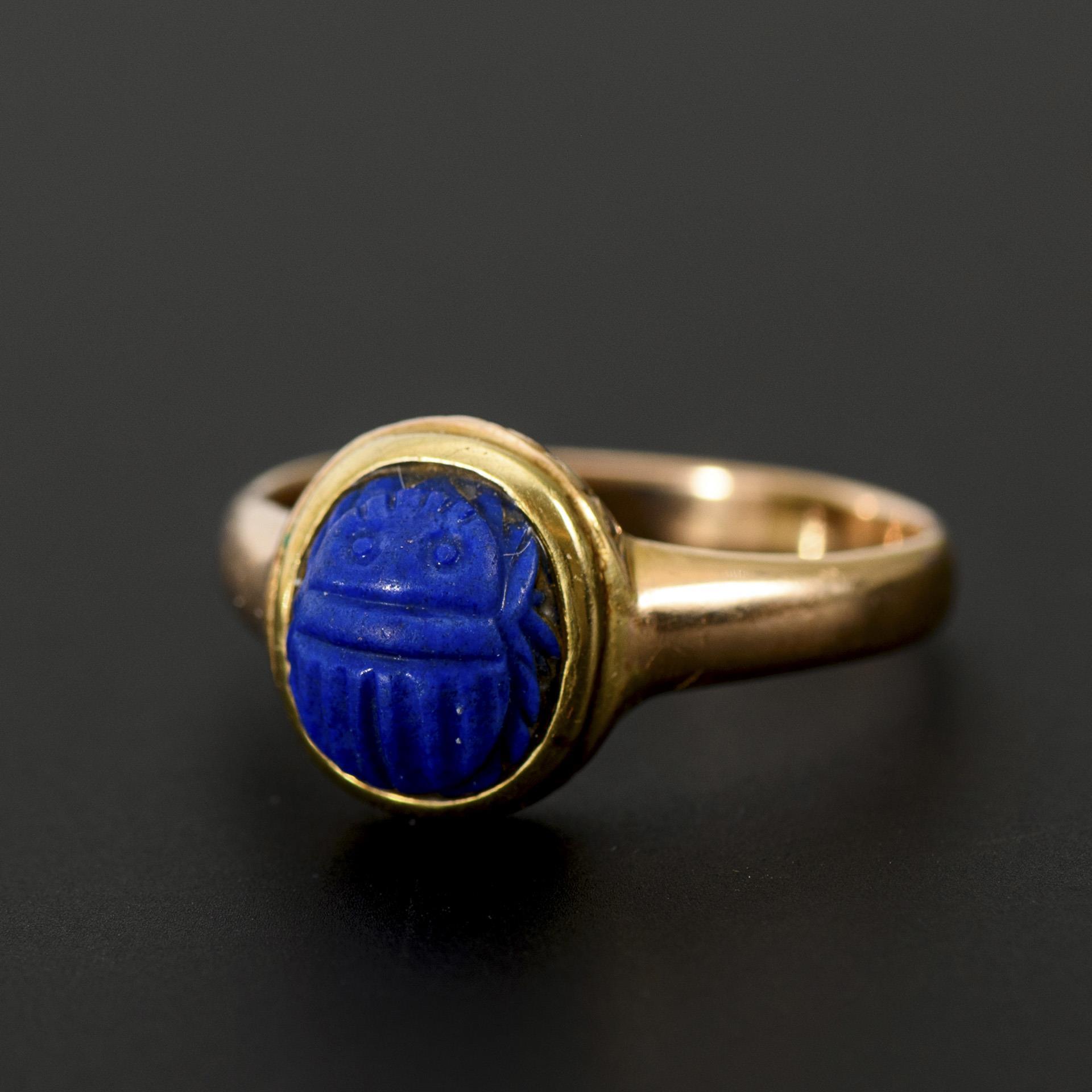 Ring mit zargengefasstem blauen Stein, wohl Lapislazuli, als käferartiges Schnitzornament mit Anklängen an den Skarabäus als altägyptisches Glückssymbol gearbeitet. Unterseitig mit leichten Tragespuren.