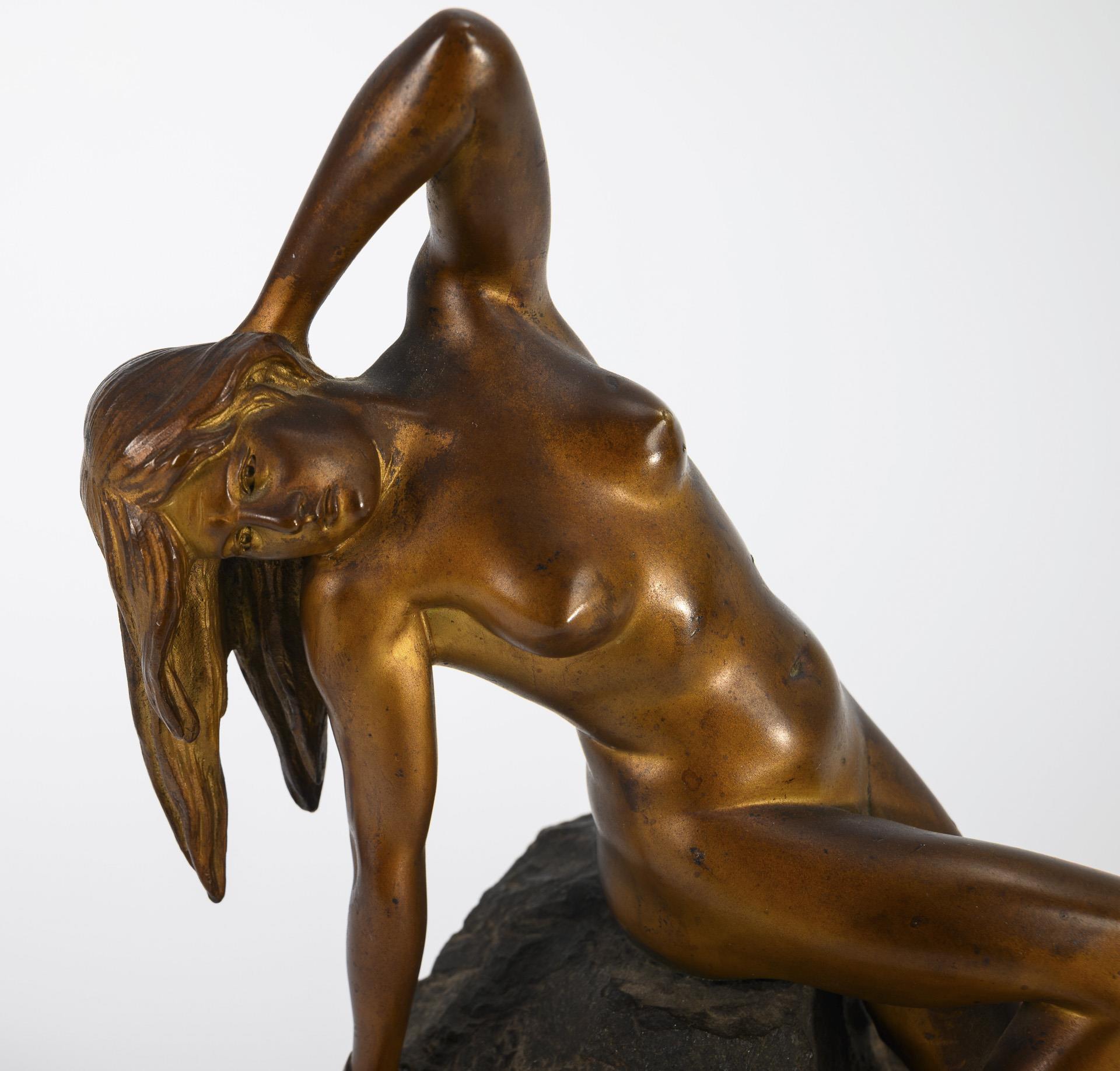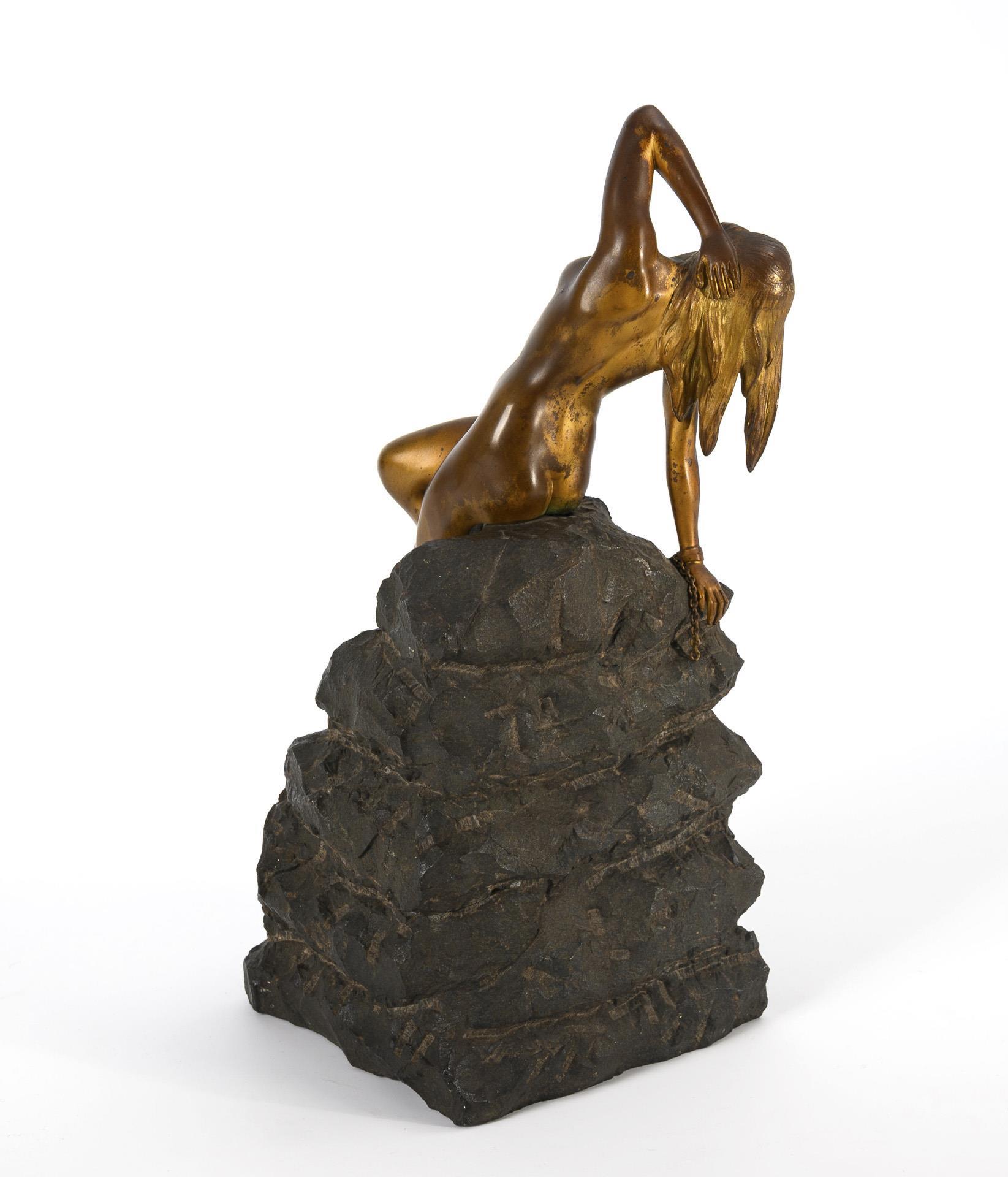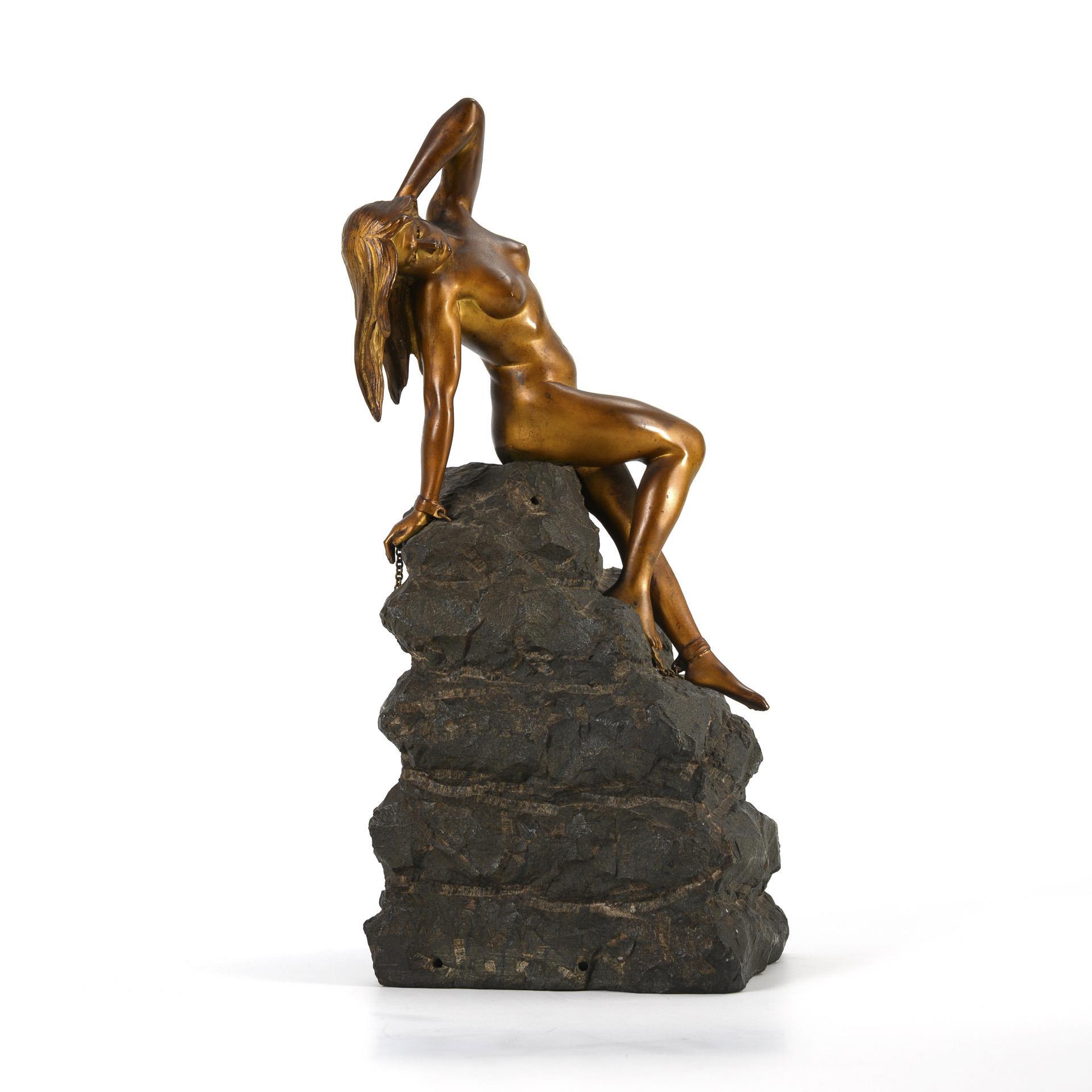 An den Fels gekettete Schönheit in aufreizender Pose. Patina fleckig, Kette und 1 Kettenbefestigung am Fels fehlen, 2 Bohrlöcher von entfernter Plakette an der Seite.