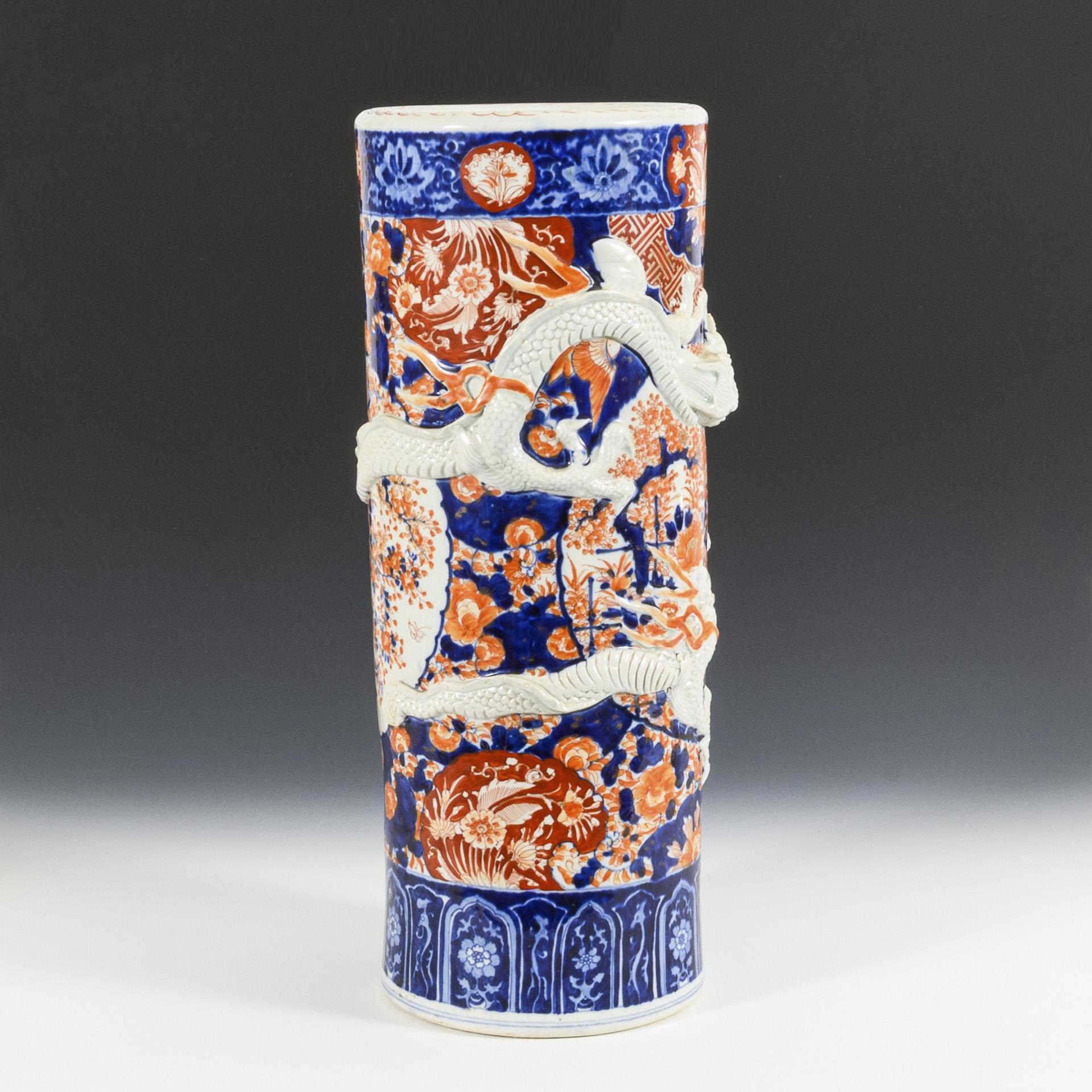 Porzellan in Unterglasurblaumalerei, Rot und Gold. H 62,5 cm, Ø 24,5 cm. 10,6 kg.