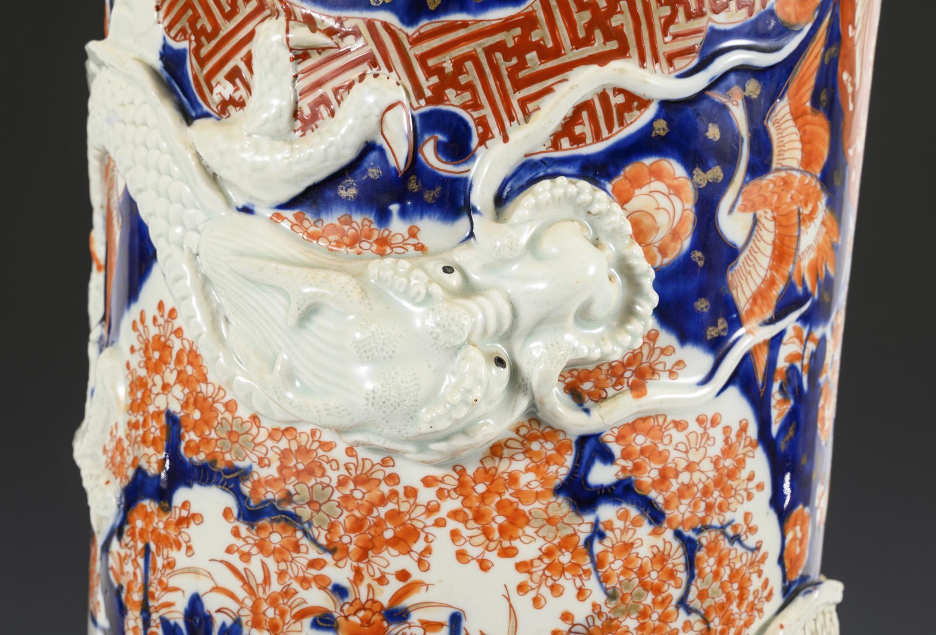 Sehr große Zylindervase mit Drachenrelief.