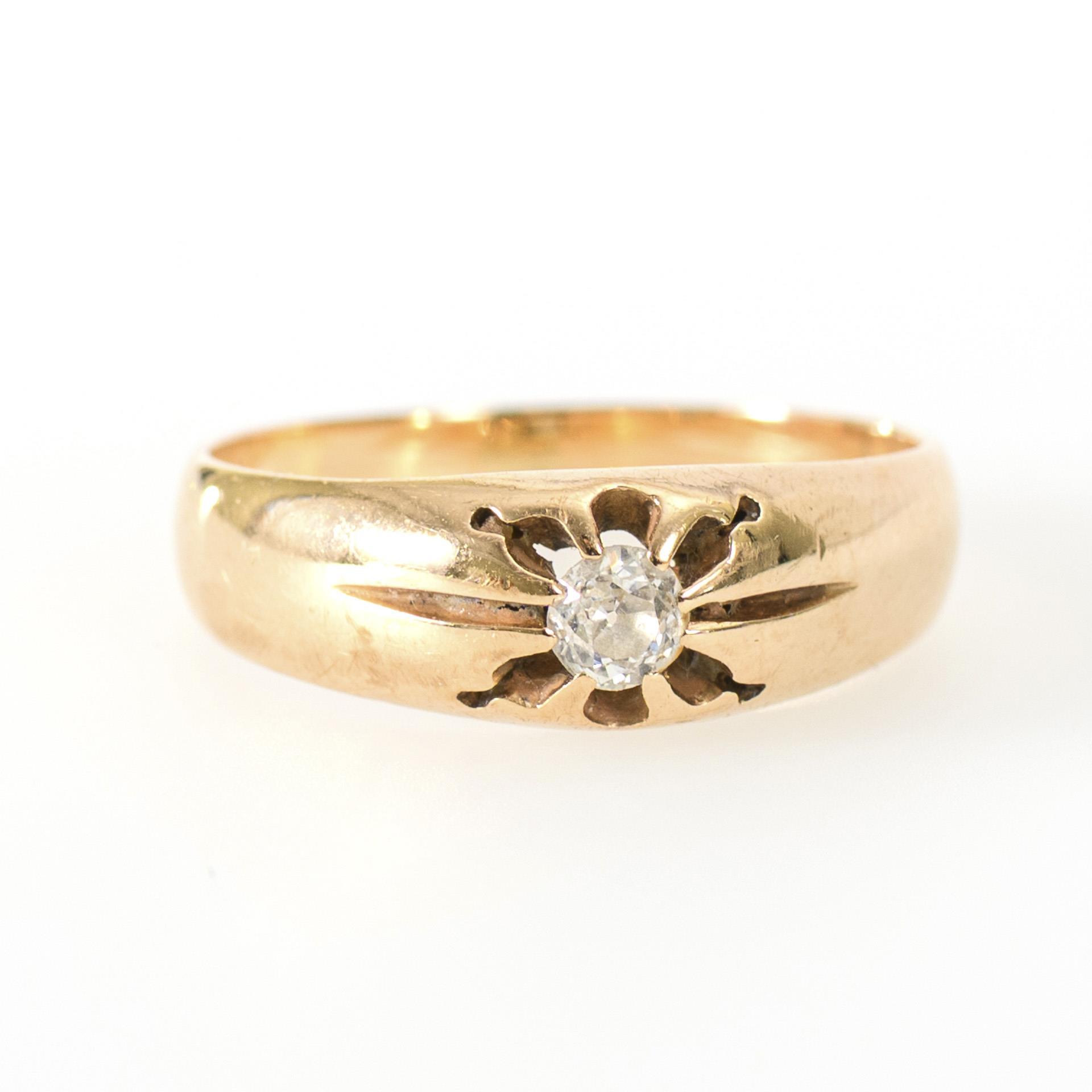 Gelbgold 585 geprüft. Ringgröße 58; Durchmesser des Brillanten (in Fassung gemessen) ca. 0,4 cm. 3,6 g.
