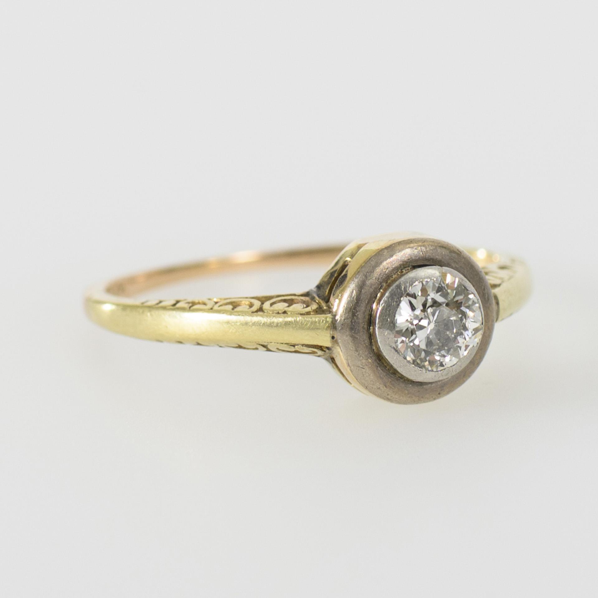 Ring in Gelbgold, die an den Ringschultern rocaillenartig ornamentierte Schiene unterseitig in Roségold, sowie die Fassung des Brillanten in Weißgold gestaltet.