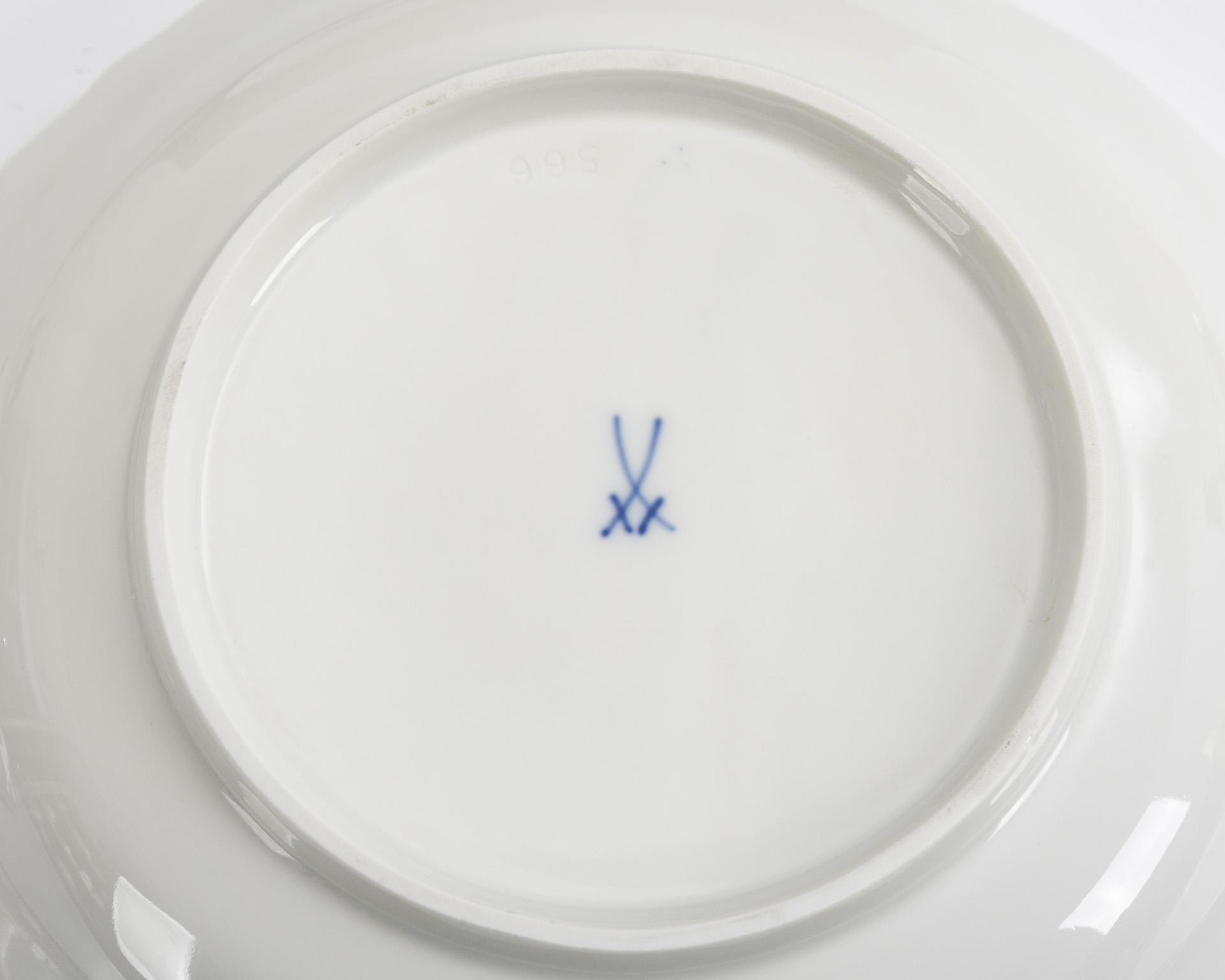 Unterglasurblaue Blumen- und Insektenmalerei, Goldstaffage. Ø 18 cm.