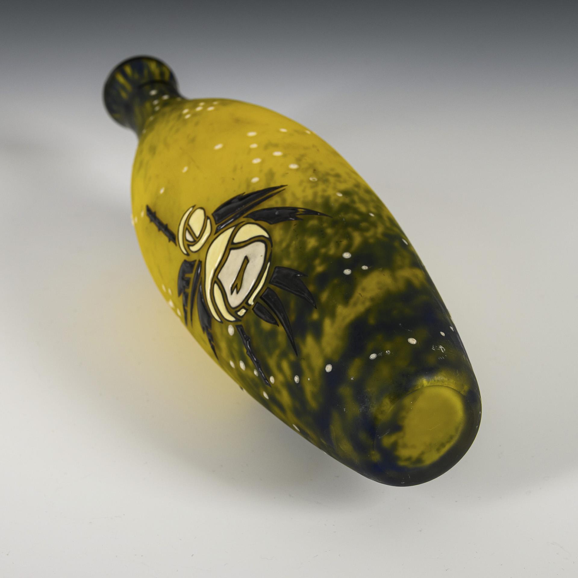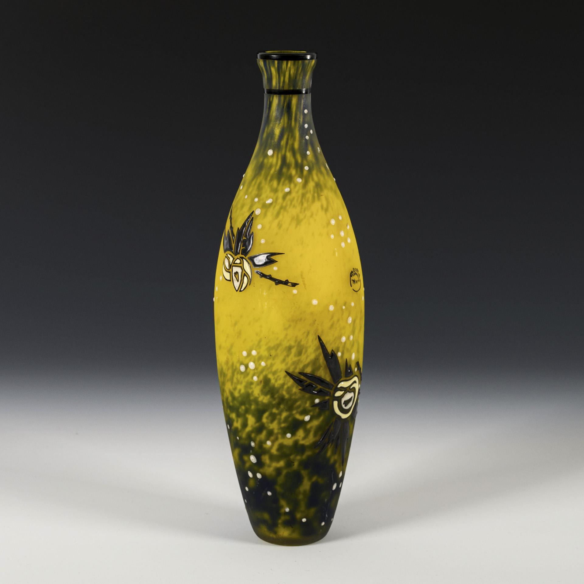 Schlank ovoide Vase aus farblosem Glas mit grünem und gelbem Pulver im Unterfang gesprenkelt. Mit Hochemail in Gelb, Weiß und Schwarz gemalte stilisierte Rosenblüten und -zweige. Kleine Bestoßung am Mündungsrand.