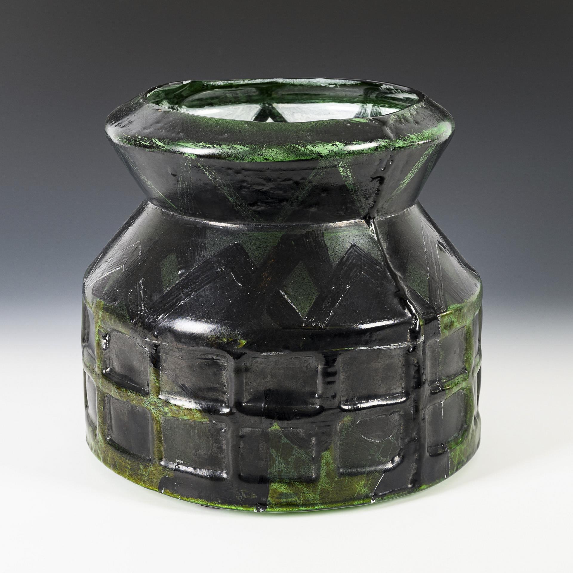 Grünes, in die Form festgeblasenes Glas mit gitteroptischer Wandung. Auf der gesamten Wandung innen und außen ein mit Kaltfarben in Schwarz, Weiß und Gelb gemaltes geometrisches Muster.