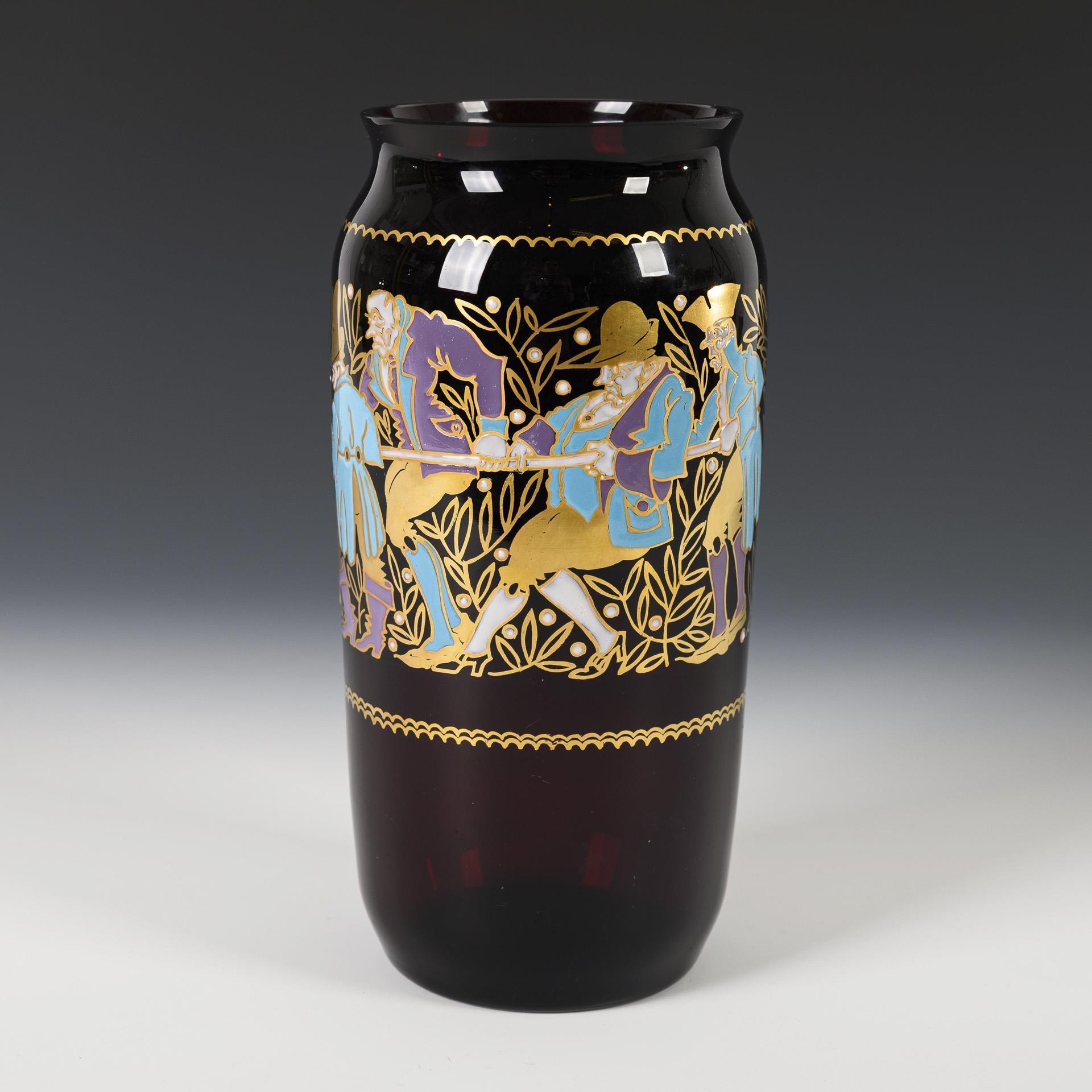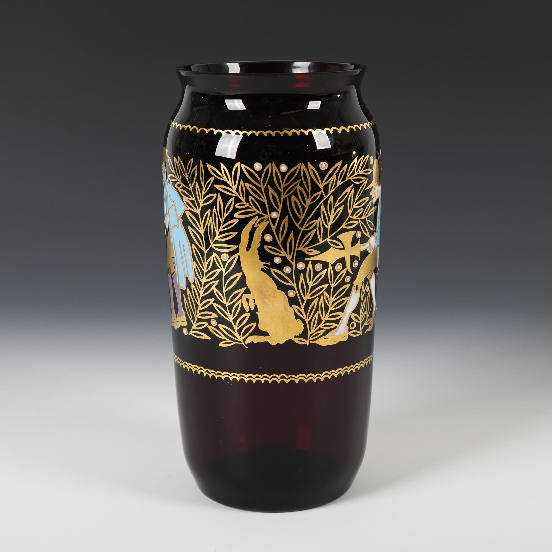 Farbloses, rubingrot unterfangenes Glas, polychrome Emailmalerei, Goldstaffage. H 24,5 cm. 640 g.