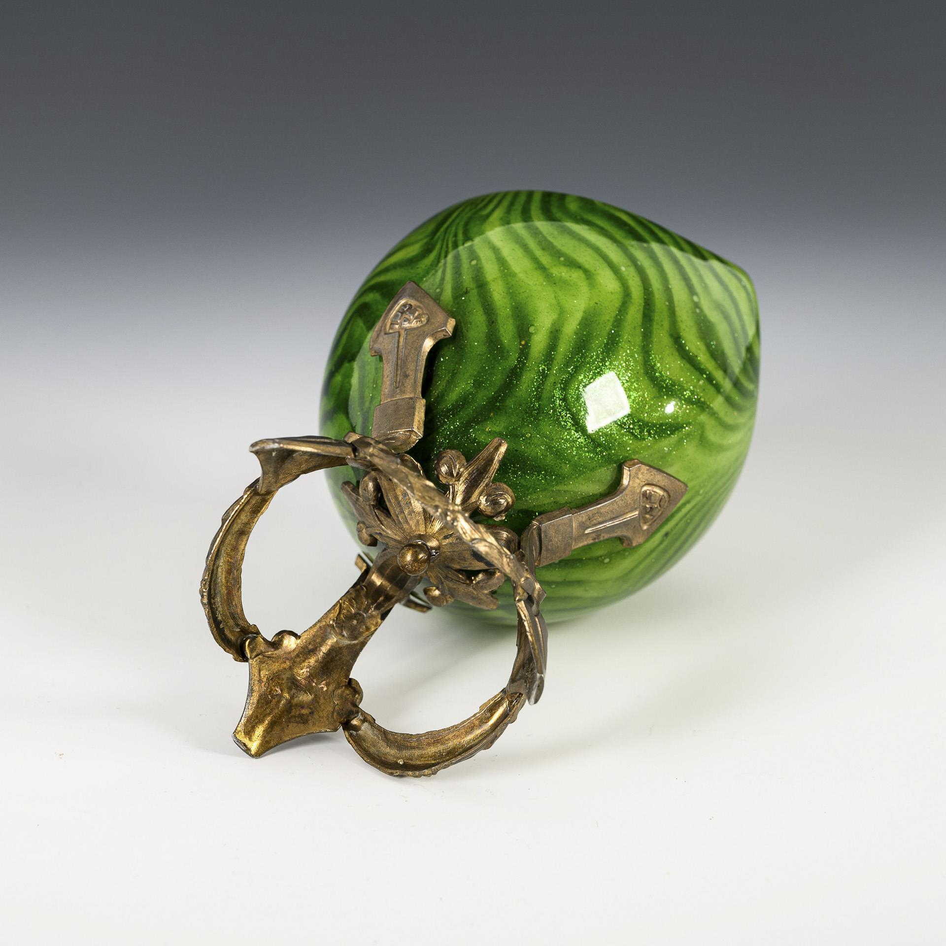 Ovoider Korpus mit dreifach weit nach innen gebogener Mündung. Jugendstil-Metallmontierung mit Festons und drei Füßen.