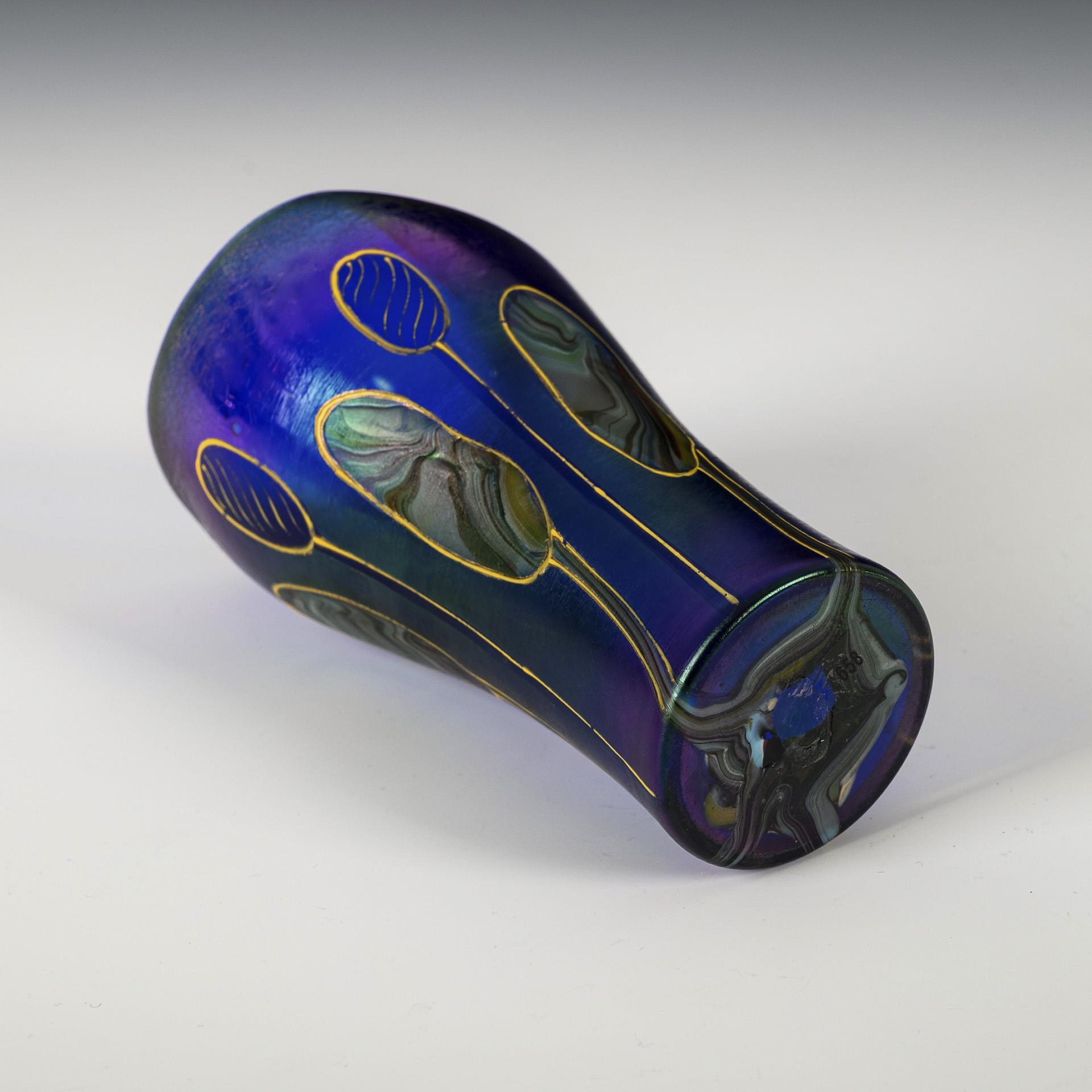 Balustervase mit einseitig eingedrückter Mündung. Auf der Wandung alternierend fünf über einem "Stängel" ovoide, marmorierte Fadeneinlagen aus vielfarbigem Glas und vier in gelbem Hochemail gemalte Ovale, gelbe Hochemailkonturierungen.