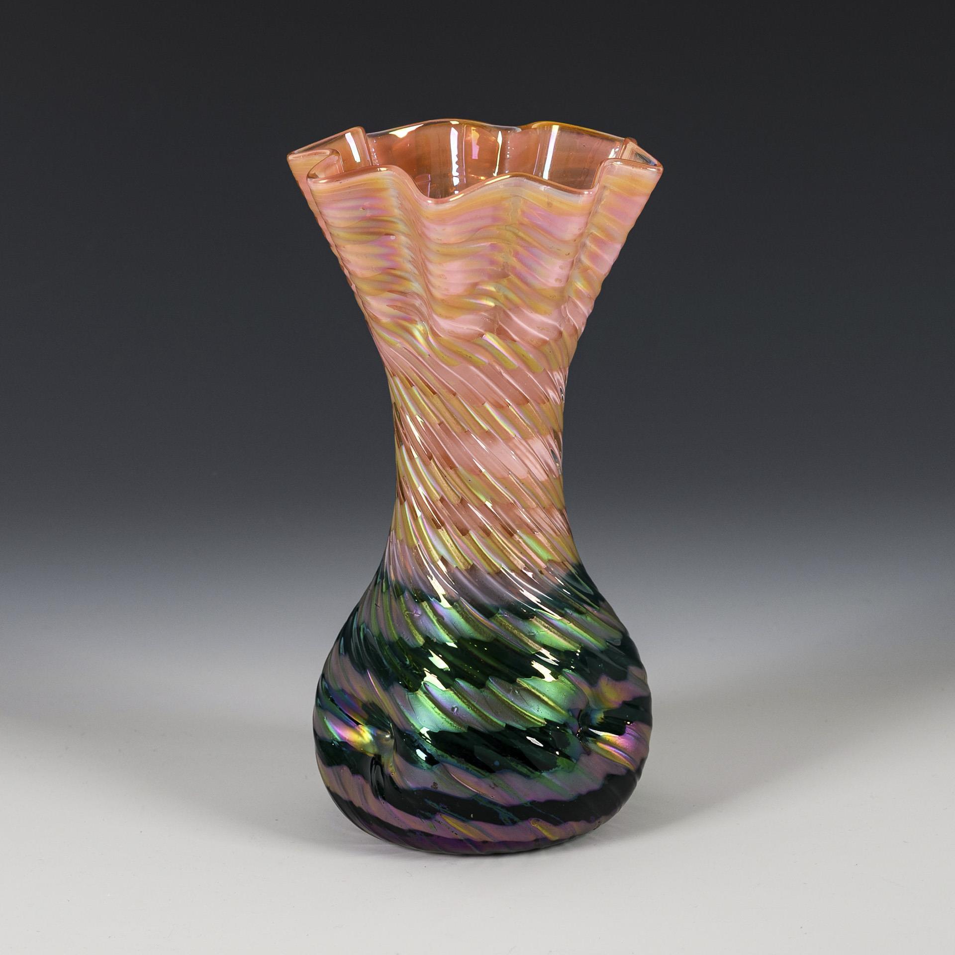 Farbloses, rosaopal und grün unterfangenes Glas, mit silbergelbem Band spiralförmig umsponnen, irisiert. H 18 cm. 370 g.
