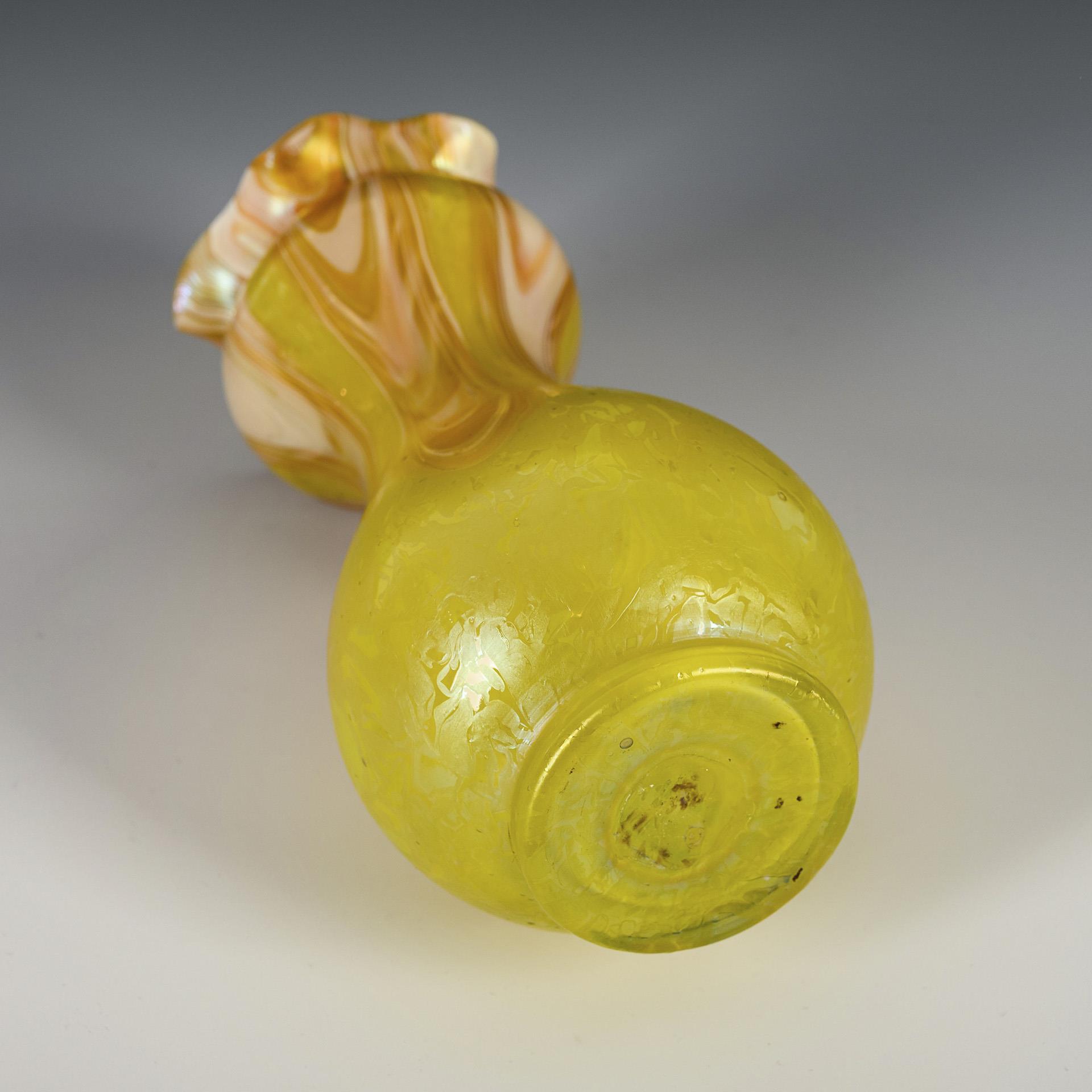 Farbloses Glas mit gelbopalem Unterfang und aufgeschmolzenen, farblosen Kröseln. Von der Mündung fünf herabgezogene, opalweiß und hell-orangebraun marmorierte Zungen, irisiert. H 17 cm. 230 g.