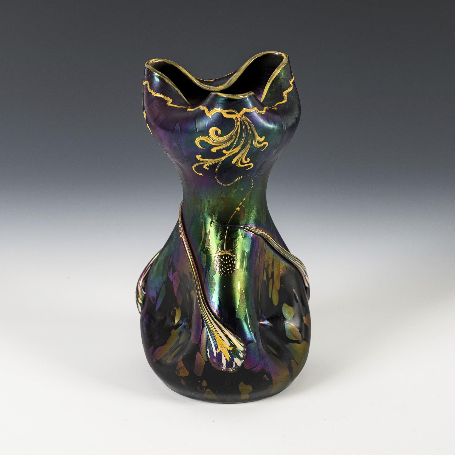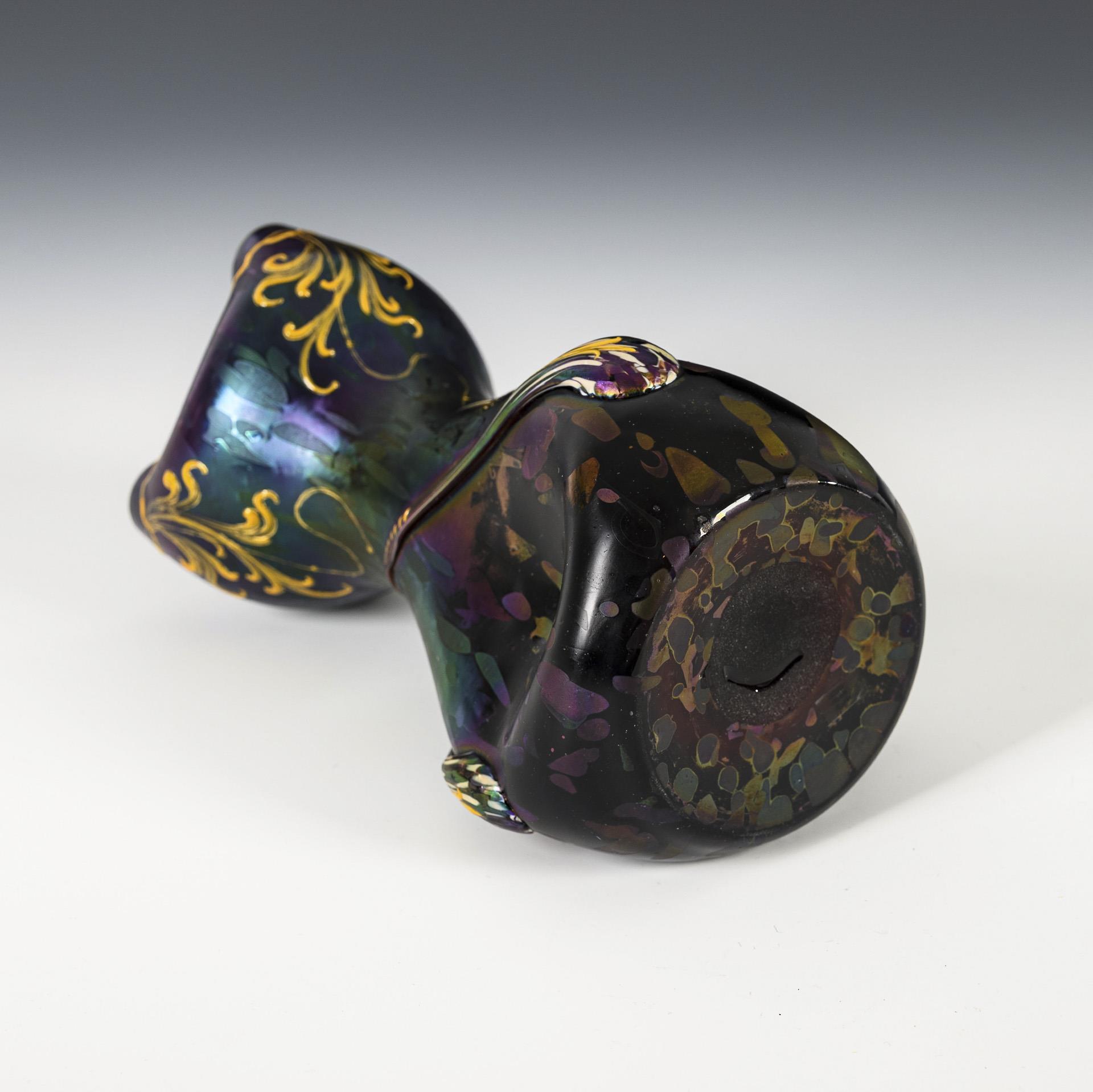 Birnvase mit dreifach eingedrückter Wandung und geweiteter, dreifach nach innen gelappter Mündung; ausgekugelter Abriss. Auf der Wandung drei Tropfenauflagen aus farblosem Glas mit mehrfarbigen Kröseln. Auf der Wandung, dem Mündungsrand und den Tropfen Hochemailbemalung in Gelbemail mit Ranken und drei herabhängenden Erdbeeren.