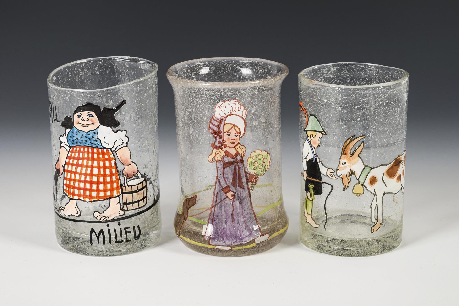 Überwiegend zylindrische Becher mit verschiedenen Motiven: Biedermeier-Mädchen mit Dackel (bezeichnet "Ges. gesch. No 3."), Hirtenjunge mit Ziege (bezeichnet "M. Sch.") und Bäuerin mit Milcheimer (Stall-Milieu, bezeichnet ("Muster-Schutz").