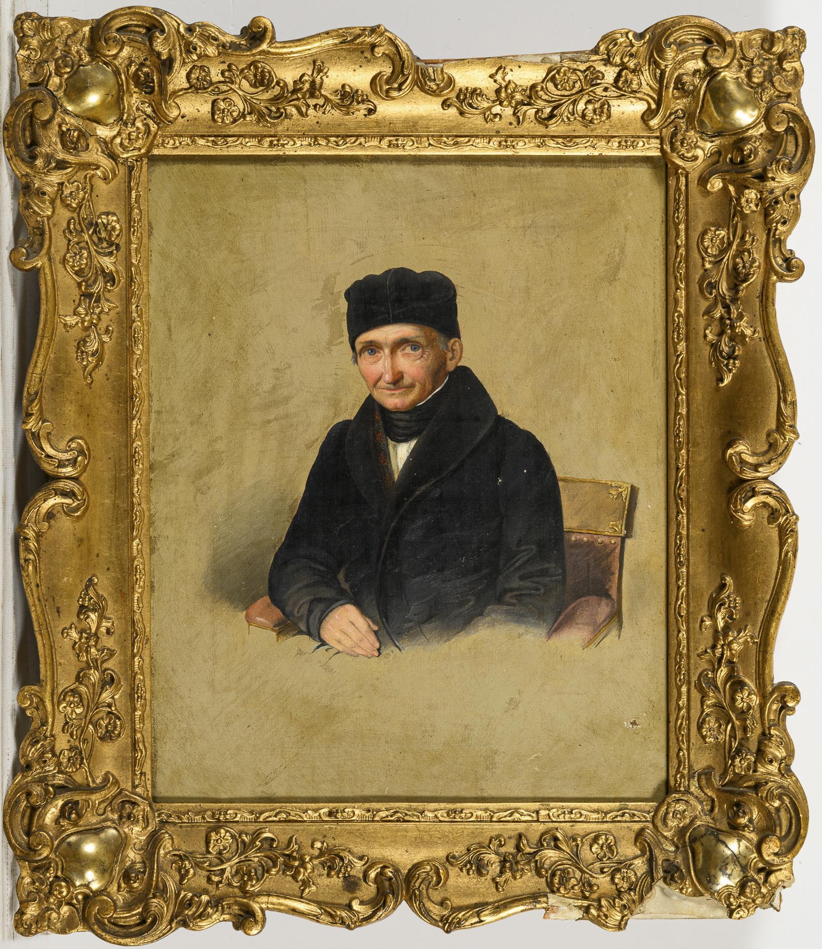 Porträt eines älteren Mannes in schwarzer Kleidung in einem Armlehnstuhl vor neutralem Hintergrund. Leichte Altersspuren.