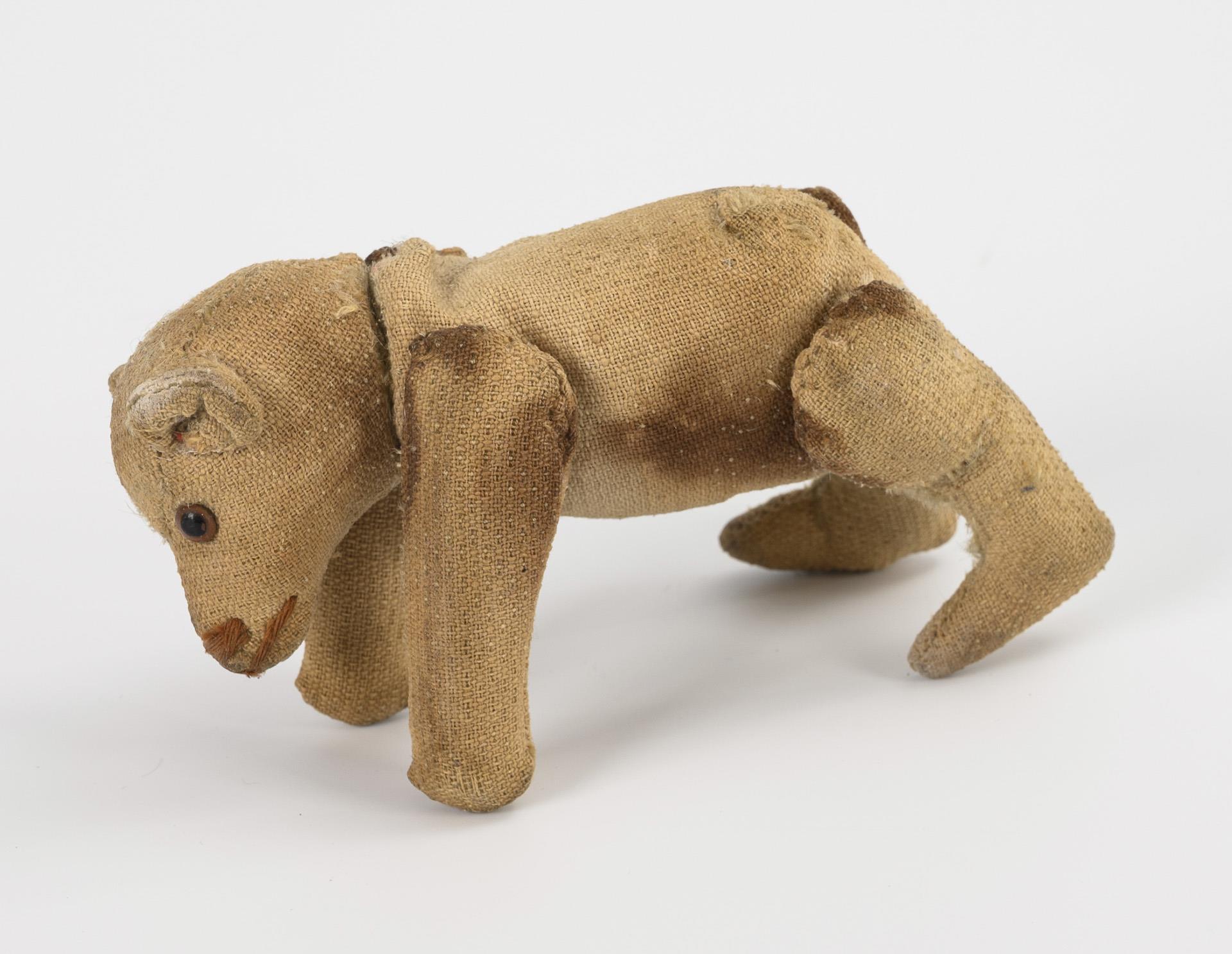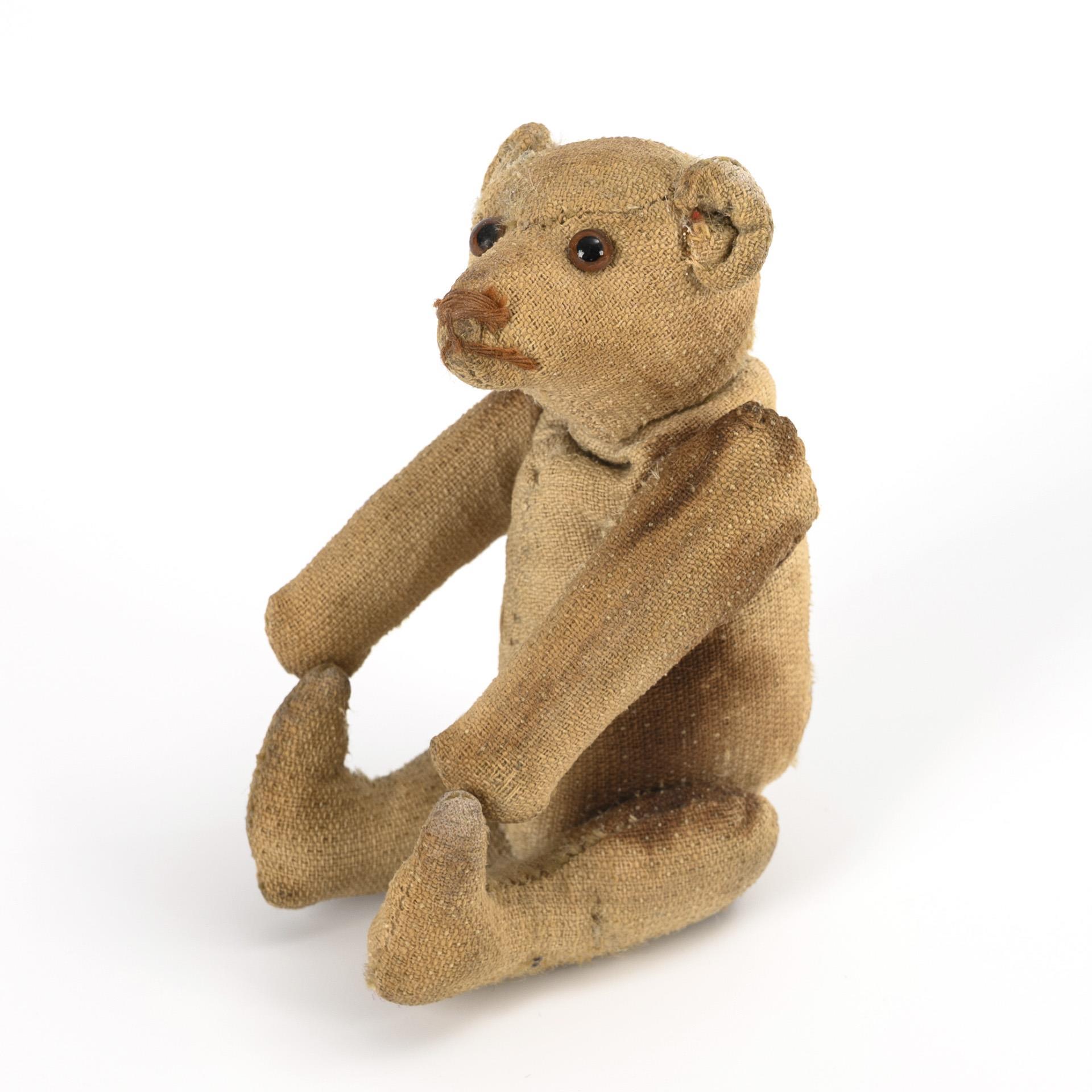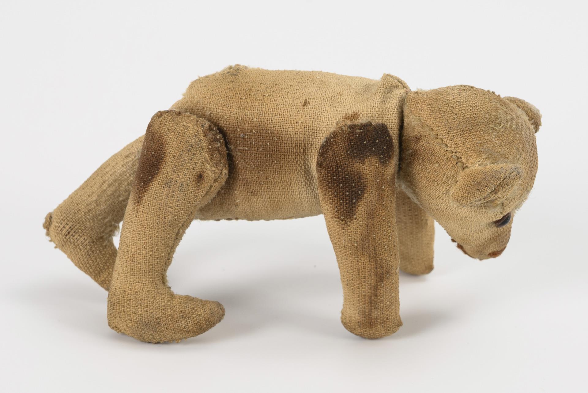 Abgeliebter, ehemals weißer Teddybär mit brauner Nasenbestickung, Glasaugen und Klapperball im Körper. Komplett verkahlt, Gewebe fleckig.