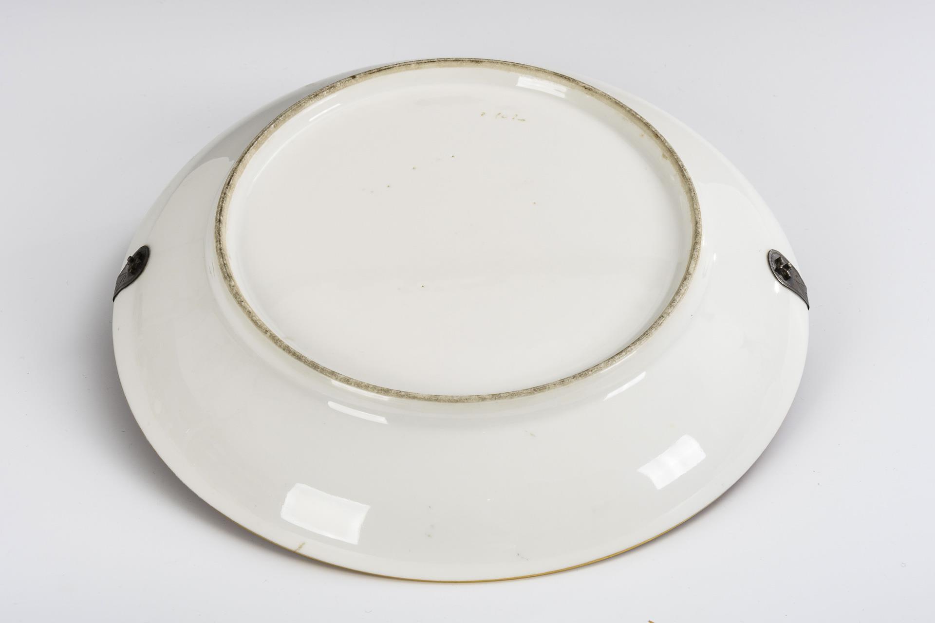 Schale mit silbernem Bügelhenkel und rosa Fond, im Spiegel ein goldgerahmtes Medaillon mit der Darstellung einer Flusslandschaft mit Hirtin. Minimaler Farbabrieb am Fond.